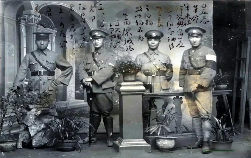 1925,炮兵2营营长陈诚(右二)与战友们身着规整军装的军人立于照相馆布景前,肩带、腰带衬出军人的挺括姿态,而每人臂弯处挽着的黑纱,是此刻最沉重的注脚——此时距孙中山因病离世不过数日,以这一细节,藏起哀恸,保持着军人的严整。