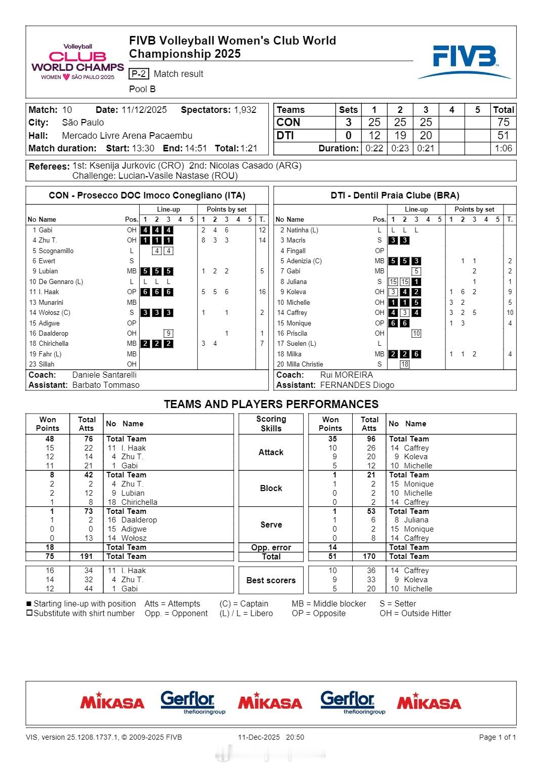 【女排世俱杯科内3-0完胜海滩夺小组第一 朱婷14分】国际排坛战报速递中国排球留洋动态12月11日巴西圣保罗,2025女排世俱杯B组头名之争,意大利科内利亚诺3-0(25-12/25-19/25-20)轻取巴西海滩,三战全胜排名小组第一。哈克16分、朱婷14分(14扣12分2拦)、加比12分,卡弗雷10分。