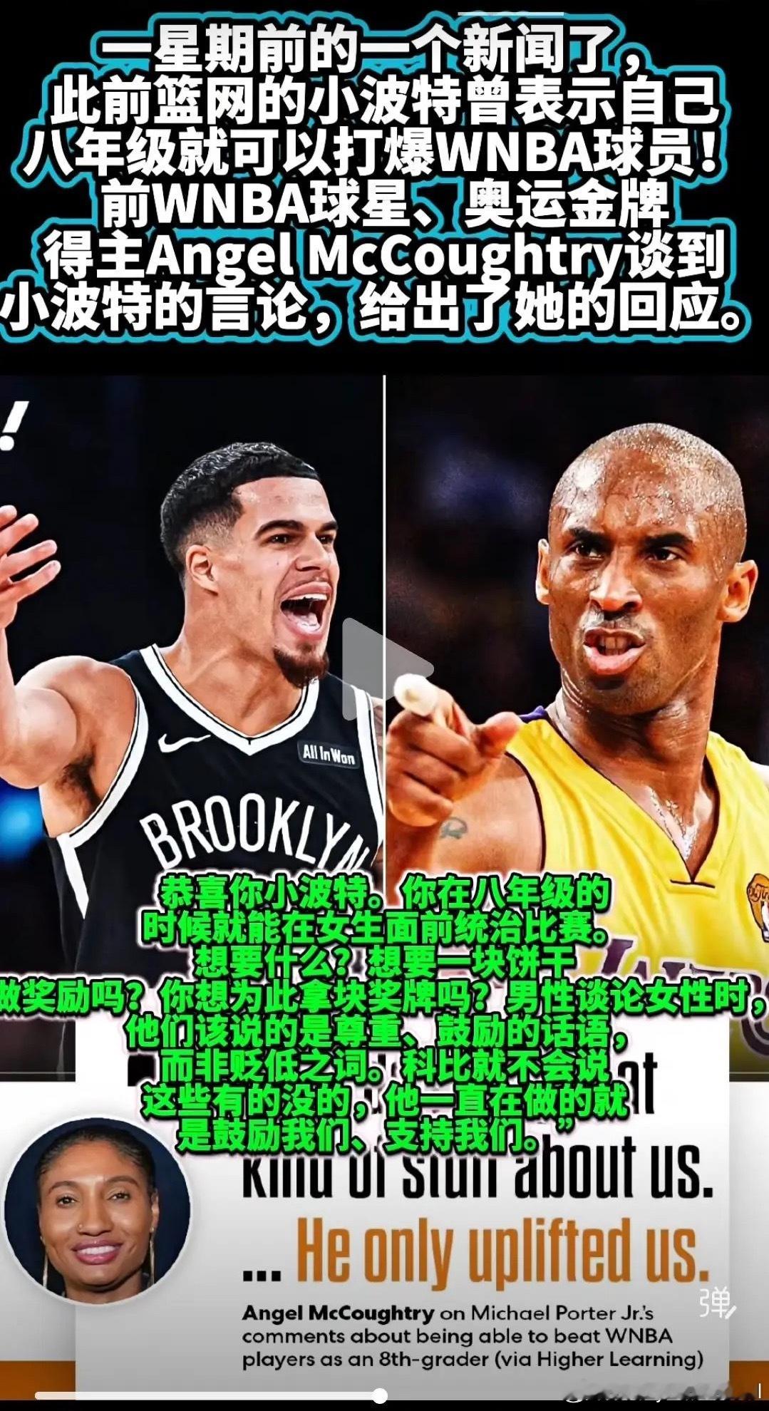你们觉得小波特不尊重人吗?小波特说自己八年级就可以打爆wnba球员,前WNBA球星、奥运金牌得主Angel McCoughtry以科比为例子向小波特开炮反怼