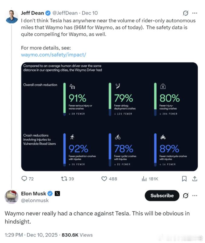 特斯拉Robotaxi日前,特斯拉CEO埃隆·马斯克在xAI黑客马拉松活动上透露,其在奥斯汀运营的特斯拉Robotaxi将在三周内取消安全员。巧合的是,谷歌DeepMind、谷歌Research首席科学家Jeff Dean随后在社交媒体发文:“我认为特斯拉在‘仅有乘客的自动驾驶(即取消安全员)里程’方面远远比不上Waymo(截至今天,Waymo已达9600万英里),Waymo的安全数据也颇具说服力。”马斯克则在下面评论贴脸回怼:“Waymo在与特斯拉的竞争中从未真正有过胜算,事后来看会一目了然。”