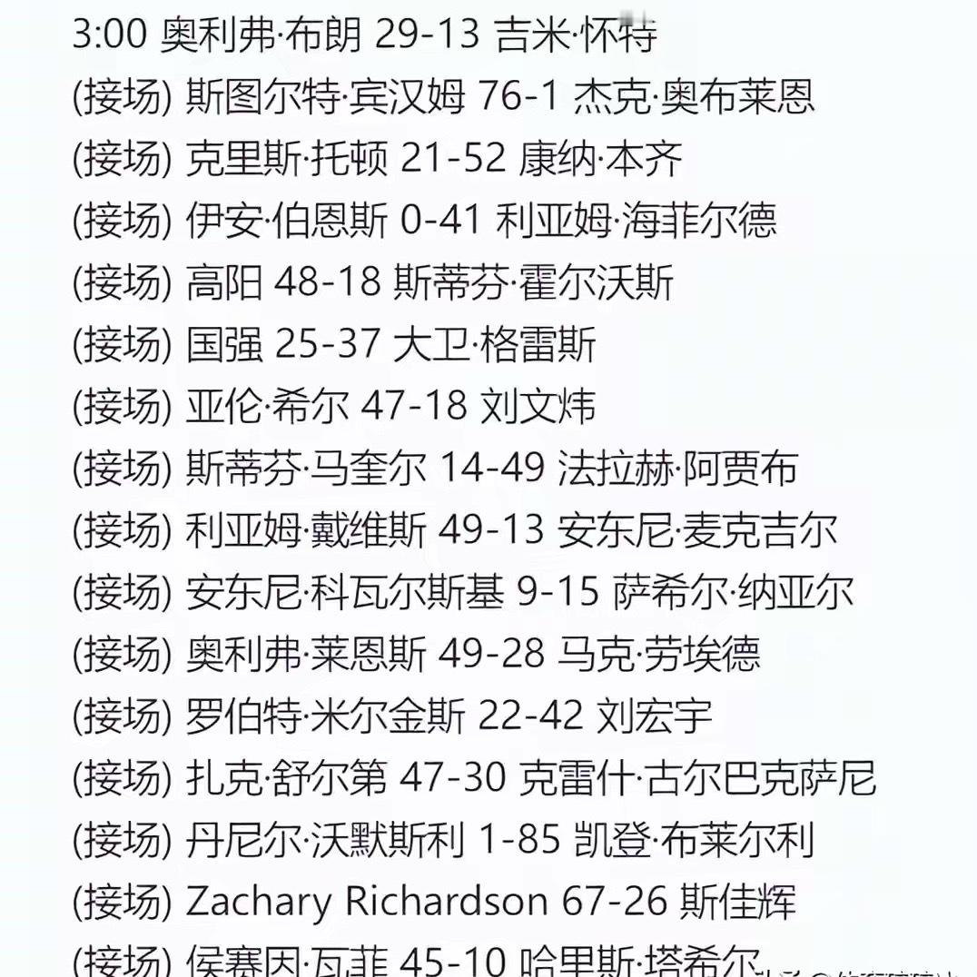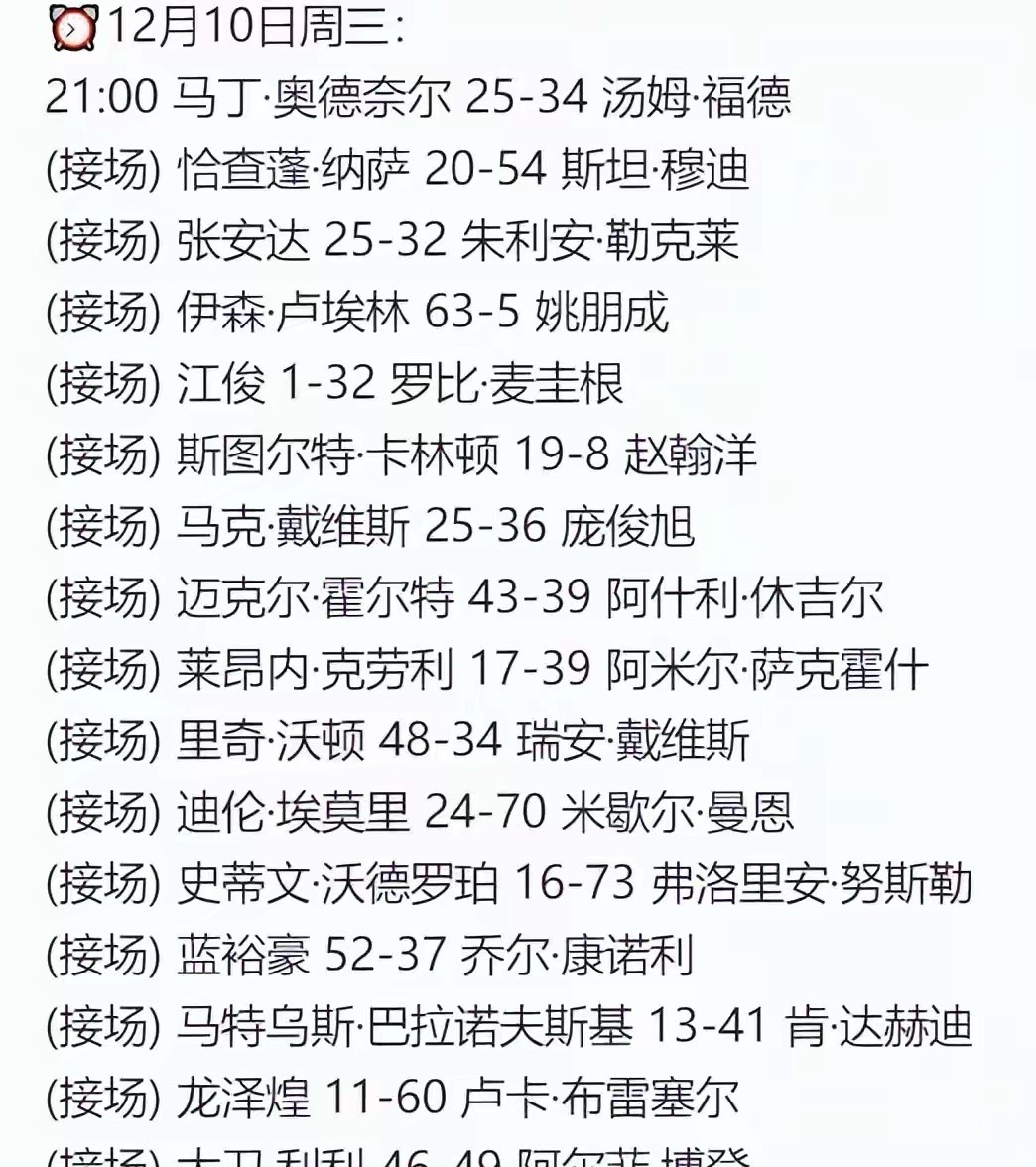 斯诺克最新战报:64强全部出炉、中国12席,赵心童、斯佳辉爆冷!北京时间12月12日早,2025年单局限时赛第二个比赛日的赛事结束,至此64强全部诞生。中国这次报名的共28人,其中傅家俊和雷佩凡临阵退赛。最终出战的共26人,只有12人晋级成功,比较尴尬的是前16的赵心童和斯佳辉双双爆冷。单局限时赛也是排名赛,冠军奖金是5万英镑。这项赛事限时10分钟打完,前5分钟15秒出杆,后五分钟则是10秒,节奏非常欢乐,属于娱乐性质的赛事,一局定胜负。这项赛事是单桌制度,球员一组接着一组出场,每日出战的都有32组球员,所以第一轮为期两天结束。12月10日是第一个比赛日,出战的中国球员少一些,其中晚上九点时间段共出战了7位选手,最终只有2位晋级成功。张安达25-32输给了勒克莱、姚朋成5-63输给了伊森卢埃林、江俊1-32输给了罗比麦奎根、赵瀚洋8-19输给了卡林顿、龙泽煌11-60输给了卢卡。庞俊旭36-25战胜了马克戴维斯、蓝裕豪52-37战胜了康诺利。凌晨三点出战了两位中国选手,全部晋级,其中许医尘72-3战胜了塔猜亚、周跃龙89-0战胜了布拉德福德。12月11日是第二个比赛日,晚上九点共出战了12位中国球员,阵容十分庞大。这次是6人晋级成功,6人被淘汰出局。其中吴宜泽141-0战胜了斯泰德曼、常冰玉72-15战胜了普伦、袁思俊75-15战胜了巩晨智、吴安仪37-24战胜了艾伦、范争一61-26战胜了阿尔菲达维斯、白雨露40-26战胜了伊丽丝。徐思25-49输给了桑坎姆、张家玮1-66输给了格雷姆、赵心童21-34输给了缪尔、黄佳浩1-15输给了迪维尔、王雨晨0-69输给了帕特尔。凌晨三点时间段共出战了五位选手,最终高阳和刘宏宇晋级成功、而斯佳辉、刘文炜以及国强则被淘汰出局。首先出战的是高阳,他是第六场出战的选手,对阵的是霍尔沃斯,这场比赛,双方并没有高一点的单杆得分,几次上手,最终高阳48-18晋级成功。国强是第七场出战的选手,他对阵的格雷斯,这场比赛,双方发挥的半斤八两,最终格雷斯37-25晋级成功。刘文炜是第八场出战的选手他对阵的是亚伦希尔,这场比赛,刘文炜打出来了18分,希尔则是一共打出来了47分轻松获胜。刘宏宇第是12场出战的选手,他对阵的是米尔金斯,这场比赛,刘宏宇以42-22的比分晋级成功。斯佳辉是第15场出战的选手,也是这个时间段最被看好的选手,没想到他居然输了。单局限时赛退赛还是比较严重的,除了傅家俊、雷佩凡,斯佳辉的对手克雷吉也临阵退死啊了。这项赛事和其他的赛事不一样,就算对手阵前退赛,球员也不能轮空晋级,主办方会再挑选业余球员补上空缺。最终,斯佳辉对阵的是扎卡里·理查森。按理说斯佳辉应该赢得挺轻松,结果,他就打了26分,反而是理查森总分单杆59总分67晋级成功。本次前16球员报名的本来就只有6位,现在随着赵心童、艾伦、斯佳辉被被淘汰,就只剩下墨菲、吴宜泽、加里威尔逊三人了,他们都晋级成功了,吴宜泽还打出来了单杆141,是目前为止本次赛事的最高分。