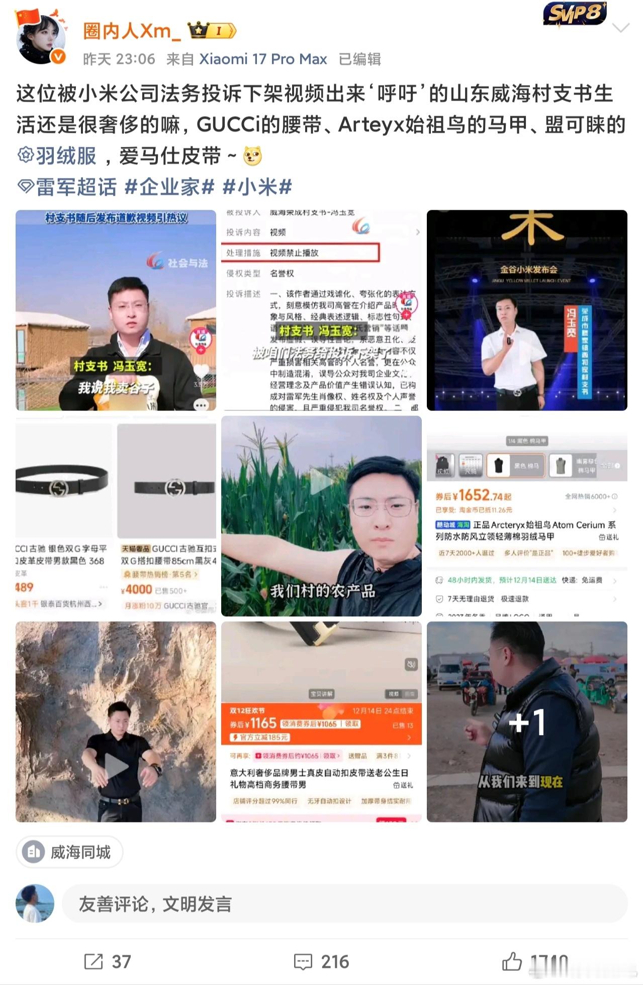 小米很仁慈了,你是正经卖小米吗?还偷换概念,网上那么多卖小米的人,怎么只有你被投诉下架了啊。我看了原视频,阴阳怪气的,各种丑陋硬蹭,活该被投诉你模仿可以但你抹黑夸大不活该嘛,而且这个人穿的衣服和开的公司都被扒出来了,古驰的皮带,4000一条,这人视频自己删的只剩一条了,名字也改了。全身名牌怎么来得呢?我觉得民众应该知晓,估计上面领导也会约谈他了。
