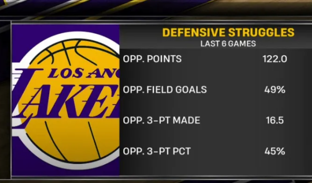NBA杯1/4决赛,马刺客场132-119战胜湖人。 本场比赛取胜后,马刺将在NBA杯半决赛迎战雷霆。 根据数据统计,湖人近6场场均失122.0分,对手投篮命中率49%,场均能进16.5个三分,三分命中率高达45%。