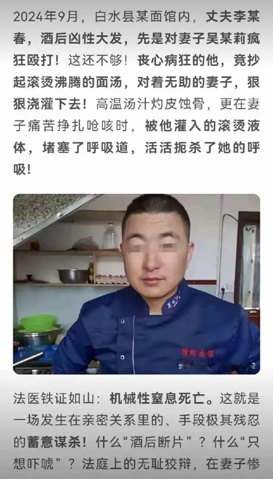 陕西渭南市一碗面烫竟夺妻子命,丈夫被判死缓 2025年12月12日,陕西省渭南市中级人民法院对李某春故意杀人案一审宣判,判处其死刑缓期二年执行,剥夺政治权利终身。 这是一碗滚烫的面汤,竟成了夺命的凶器。陕西那家深夜的面馆里,丈夫李某春将七十多度的热汤灌进妻子吴某莉的嘴里,持续五个小时的折磨,最终让一个生命黯然消逝。这真的是一场简单的意外吗? 尸检报告不会说谎,三根断裂的肋骨,满身的淤青与骨折,无声地控诉着那晚的暴行。这难道是“吓唬人”能造成的后果?法庭之上,李某春始终以“喝多了记不清”作为挡箭牌,将一切推给了酒精。然而案发前三天那条“不让离婚就让你消失”的微信,又该如何解释?监控录像里他凌晨两点还在煮面,这与平日早关店的习惯大相径庭,难道不是预谋的序曲?他的朋友声称其酒后从不打架,可店里被打掉漆的灭火器、监控杆上深深的抓痕,又是在讲述一个怎样的故事?法律的天平,此刻正面临着严峻的拷问。 吴某莉的悲剧,并非无迹可寻。去年春天,她就曾被擀面杖殴打,选择了沉默。沉默是金吗?在家暴面前,沉默或许是引向深渊的通行证。警察曾三次上门,却都未能立案,直到悲剧酿成。这中间的环节,究竟哪里出了问题?是证据不足,还是“家务事”的观念在作祟?吴家亲属悲愤地将她生前照片展示给法庭,上面写着“被丈夫用热汤烫死”,他们坚持要当庭验尸,只为寻求一个不容辩驳的真相。他们凑钱请的律师指出,“呛死”与“烫伤致死”的定性,将直接影响量刑的天壤之别。 这场风暴的中心,是两个尚未成年的女儿。一个十七岁,一个二十出头,她们的世界已经崩塌。小女儿说不想见爸爸,更谈不上原谅。姐妹俩住在亲戚家,门锁换了三次,内心深处的恐惧又岂是几把锁能隔绝的?母亲去世前三天,还在为她们的教育基金转账,这份深沉的母爱,与父亲的残暴形成了最刺眼的对比。当地妇联提供了心理咨询,她们却闭门不出,心灵的创伤,又该如何抚平? 网络上的争论早已沸反盈天。有人拿出数据,说去年家暴致死案判死刑的不到两成;有人则提起河北那起砍八刀判死刑的案子,质问司法为何出现不同的尺度。这起从今年二月就开庭,拖到十二月十二号才宣判的案子,其复杂性可见一斑。吴家亲属跑了五趟,得到的答复永远是“等着”。等待,等待正义的到来,还是等待真相被时间冲淡?他们现在唯一的执念,就是要让所有人都明白,家暴不是家务事,而是赤裸裸的犯罪。那家贴满“反家暴”传单的面馆,如今成了一座无声的纪念碑,提醒着每一个路过的人,有些底线,绝不能退让。