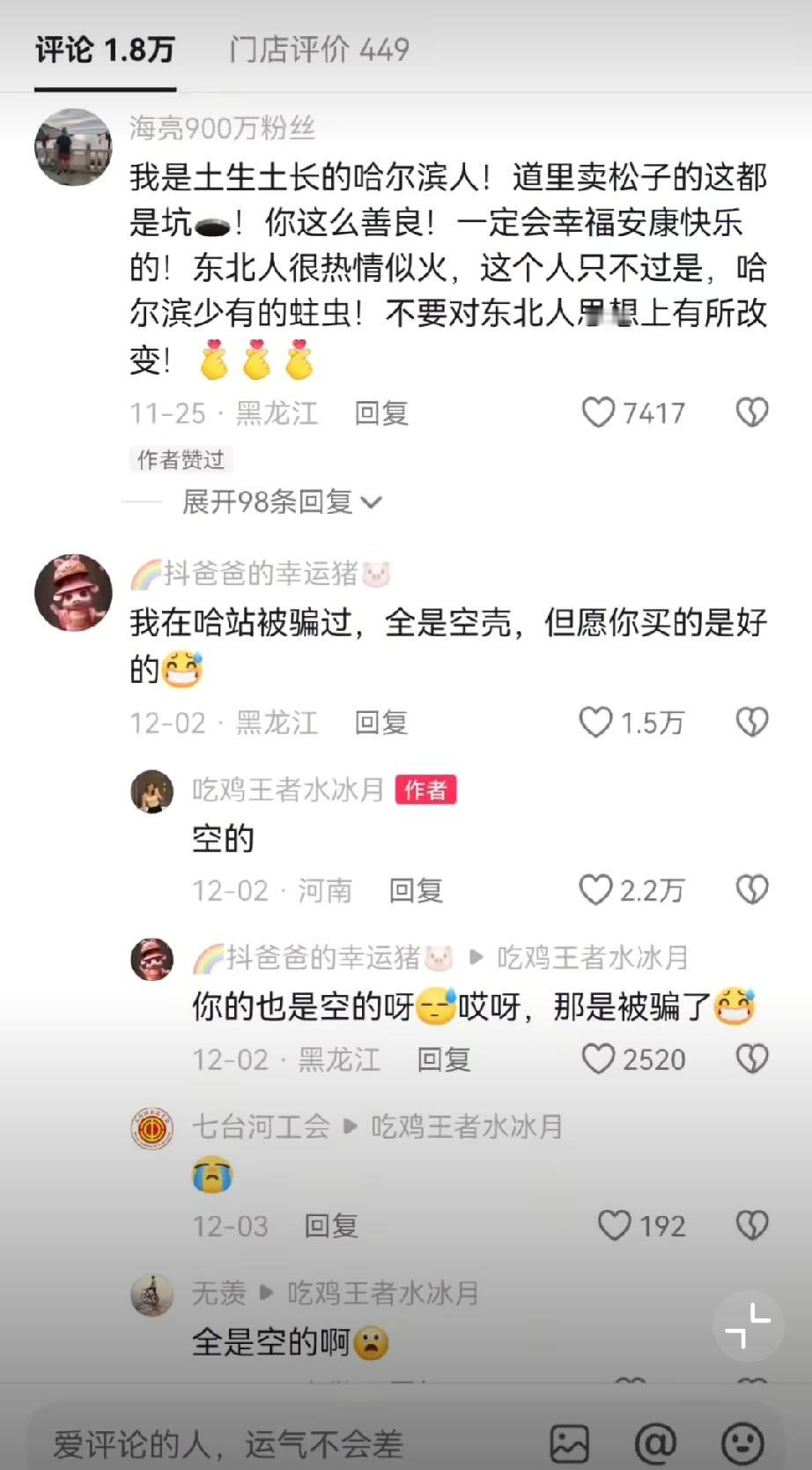 一包松子的啼笑皆非和温暖故事。上海女孩在哈尔滨一菜场买了一大包松子,卖家只要价100元,女孩认为不能让他吃亏还多给了20元。 结果视频发出后,网友纷纷提醒她小心是空壳浮子和陈货,结果可想而知,真的如此,不但空壳多,还是陈年松子,都有哈喇味… 但随后女孩又被东北网友给感动了,因为此事很多人都纷纷向她道歉,要给她寄礼物,让她看到了东北人的热情 哈尔滨爆料 分享每日正能量