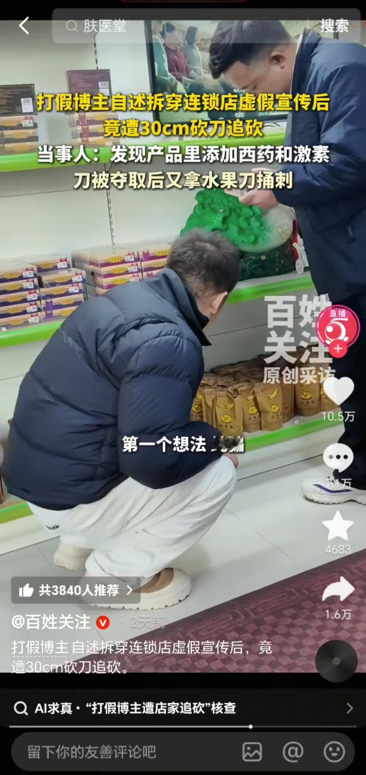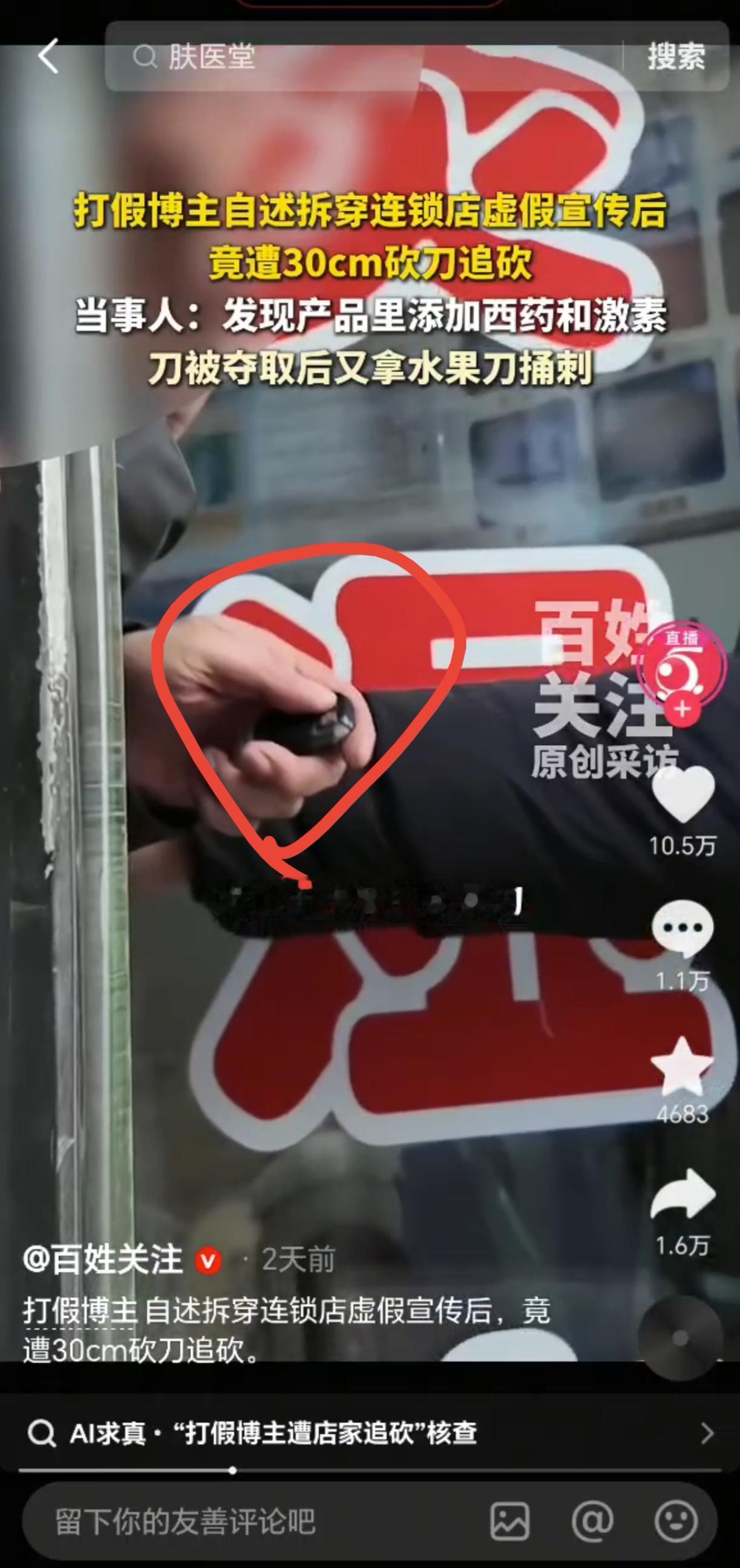 看完这个通报,我后背一阵发凉。 5天拘留,200块罚款。 这就是在长春,拿着30cm砍刀往人脖子上招呼的“代价”。 吉林长春,打假博主拆穿“肤医堂”连锁店虚假宣传后,没想到店家直接抄起30cm砍刀就往他头上砍,砍刀被夺后又拿水果刀捅刺。这事儿一传开,大伙更炸锅了。 博主说,他发现这家全国有4000家门店的连锁店,卖的产品里偷偷加了西药和激素,却宣传能治好医院都治不好的皮肤病。他去探店时,店家突然就冲出来挥着砍刀就砍,幸好他反应快把刀夺了,对方又拿出水果刀捅他,虽然只划破了衣服,但想想都后怕。 有人骂店家太无法无天,为了骗人卖货,居然敢拿刀伤人。还有人担心,全国这么多门店,得有多少人被蒙在鼓里?那些加了西药激素的产品,长期用下去身体能不出问题吗? 可也有人嘀咕,打假博主是不是也有做得不到位的地方,不然店家能这么冲动?这话一出,立马有人反驳:“不管啥原因,动手伤人就是犯法!而且卖假货还虚假宣传,本身就该被严查!” 现在市场监管部门已经介入调查了,但大伙心里的疑虑没消。一方面是打假人的安全,要是揭露真相还要被威胁,以后谁还敢去打假?另一方面是这些到处骗人的连锁店,到底得怎么管,才能让老百姓不再被坑? 这事就像一根刺扎在大家心里,不只是愤怒,更多的是对市场乱象的担忧。街头的讨论还在继续,而那种“后背发凉”的感觉,也在更多人心里挥之不去。 各位读者你们怎么看?欢迎在评论区讨论。 来源:百姓关注 2025-12-8发布