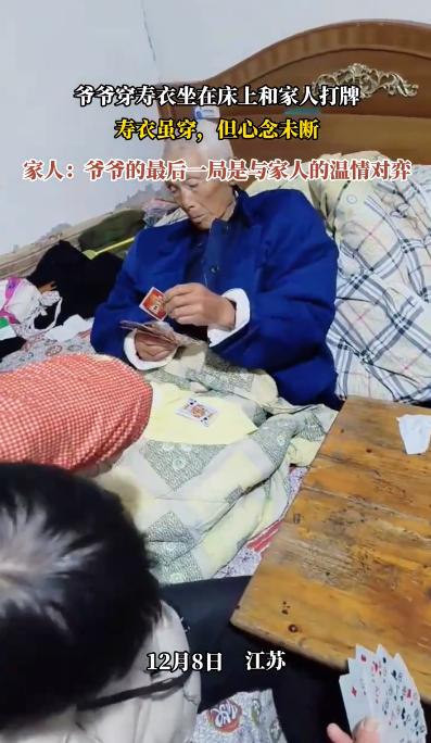 江苏,一位老人自感大限将至,便嘱咐家人为其穿上寿衣,穿好后家人都围在床边守候,没想到老人突然清醒坐起,提出想和家人一起打牌,家人也顺着老人的心意,认真陪老人打完了这最后一局牌。 “爸,要不咱们一起说说话?我们都在这儿呢。”家人刚说完,那位在床上安静躺着的老人,竟慢慢睁开了眼睛。 这件事,真是让不少人看了之后既心酸又温暖:一个已经穿好寿衣、几乎陷入昏沉的老人,突然清醒,第一件事不是交代财产,不是嘱咐孩子要孝顺,不是叫大家准备后事,而是想和家人打一局牌。 家人一开始愣住了,不知道该不该答应,怕老人太激动,怕他坐不稳,怕这会成为压力。但老人坐在那里,眼睛亮亮的,像是抓住了最后一根想要留住世界的线。 慢慢地,家人心软了,也明白了这件事的意义:或许老人不是想玩牌,而是想在离开的最后时刻,再感受一次家人围坐一桌的热闹,再听一次大家轻松的笑声,再做回以前那个坐在主位上、能带着儿孙一起热闹的老头子。 于是大家搬桌子、洗牌、分位置,老人每摸起一张牌,眼睛都亮得像年轻时一样。家人也没有像平时那样争来争去,而是格外小心、格外认真,每下一张牌都带着一点舍不得。他们明白,这或许是老人这一生的“最后一局”。 整个屋里安静得只剩牌声,却又暖得像过年。老人偶尔抬头看看每个子女,那眼神里像是在说:“有你们在,真好。”直到最后一张牌打出去,老人笑了,像是终于完成了心愿一样。那笑容稳稳的,让每一个在场的人都忍不住红了眼眶。 网友看到这事后说得特别实在:“人老了,能清醒到这种程度,还能和家人打最后一局牌,这就是福报。”很多人也感叹,原来一个人的人生走到最后,想要的都不是钱,也不是房,而是有人陪、有笑声、有牵挂、有温度。 这件事让不少人突然明白,老人真正的恐惧不是死亡,而是孤独,是没人懂自己,说不上话,看不到自己一生牵挂的人。而家人愿意坐下来,陪他打这一局牌,给了他最大的尊重和体面。 整件事没有大悲大喜,没有泪崩的场景,但就是这种平静得像日常生活一样的告别,最能戳人心。因为这才是真正的中国式情感:不说爱,却用陪伴表达;不讲生死,却把最后的柔软留给最亲的人。 人的最后一程,没有什么比“被家人温柔地陪伴”更重要。这位老人走得并不孤单,也没有遗憾,而那最后一局牌,也会成为家人一辈子都忘不了的画面。 信息来源: 渝事观察丨爷爷穿寿衣坐在床上和家人打牌,寿衣虽穿,但心念未断 文丨小王 编辑丨史叔