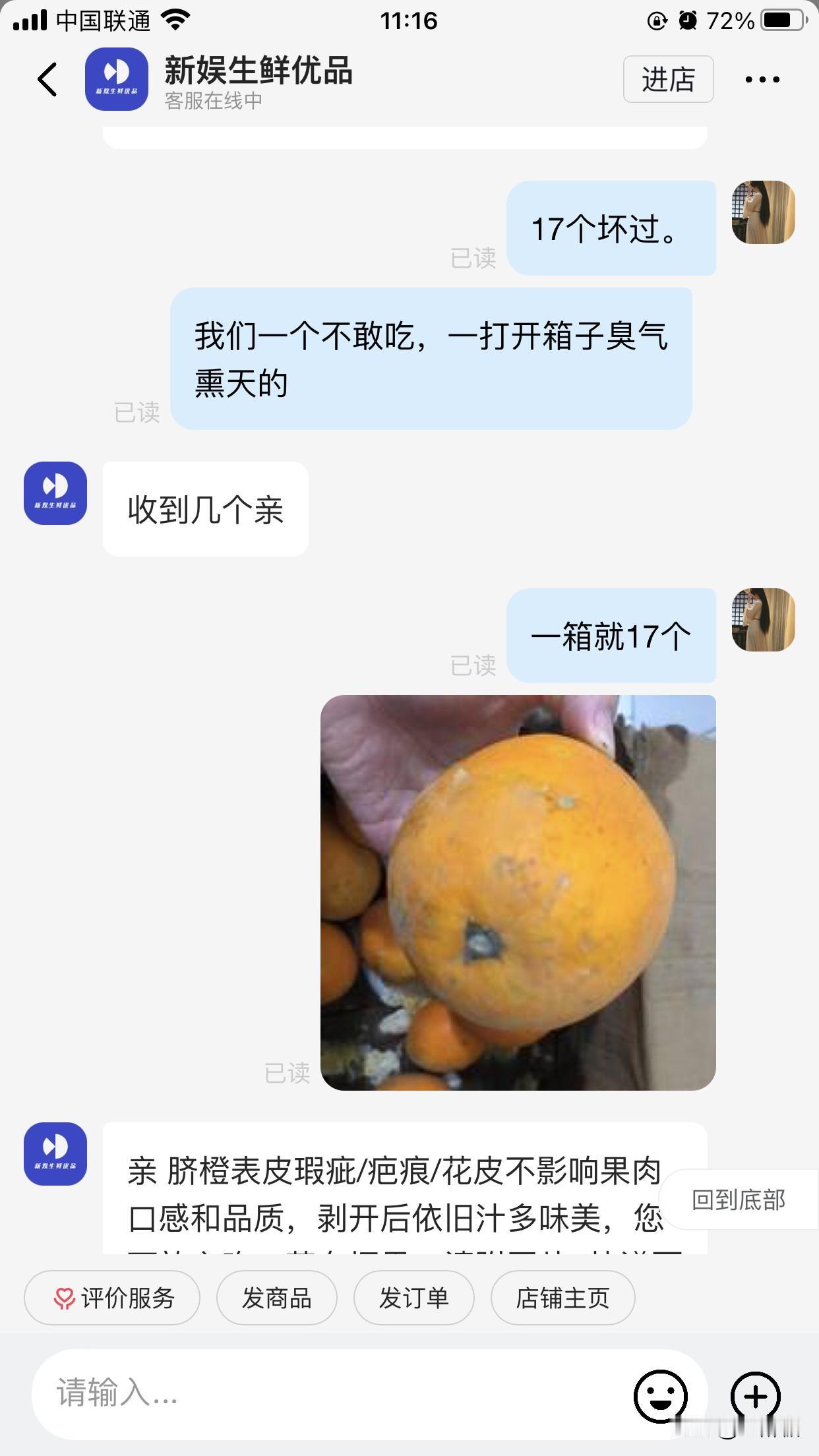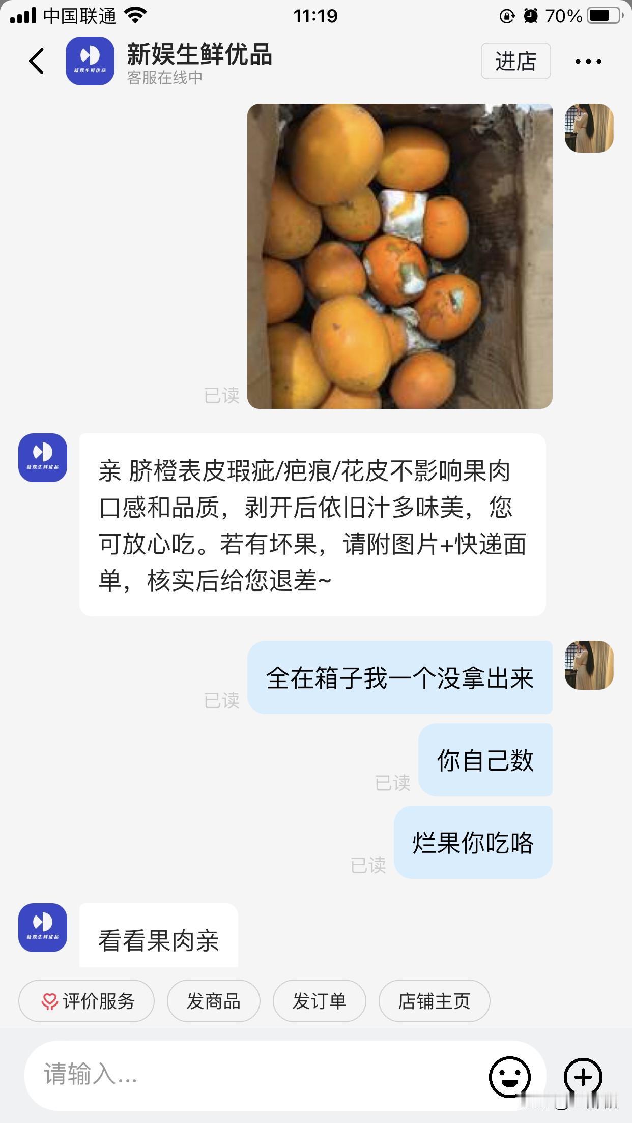 昨晚驿站人员拍了视频和照片给我, 驿站人员说一箱果都是坏的, 我把照片发给客服, 客服让我打开看里面的果, 说是按坏的个数赔, 好吧!要先签收打开拍果, 后来我老公把件拿回来, 我打开后就是图片这个样子, 拍了照片发给客服, 客服一味要求我打开皮看果肉, 买水果第一次听要求打开皮看果然的! 这件事从昨晚搞到现在! 本来驿站叫拒收奈何水果不能拒收, 按坏多少个赔多少,我理解算它合理, 可是这一箱果子拍了动态照片, 明眼人都知道食品已变质, 还让打开果肉看看。 因为臭,昨晚拍完水果照片连夜拿出去丢掉了。客服早上上班找她理赔,对方把水果链接下掉了,并且不积极理赔,食品变质了不承认错误。发了照片也不承认!我说我送一箱给你吃,她说不能的!
