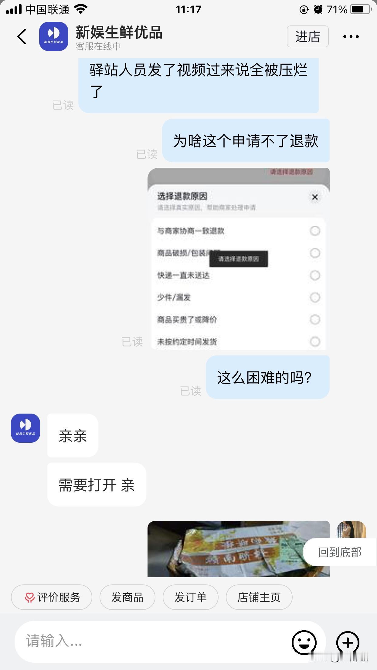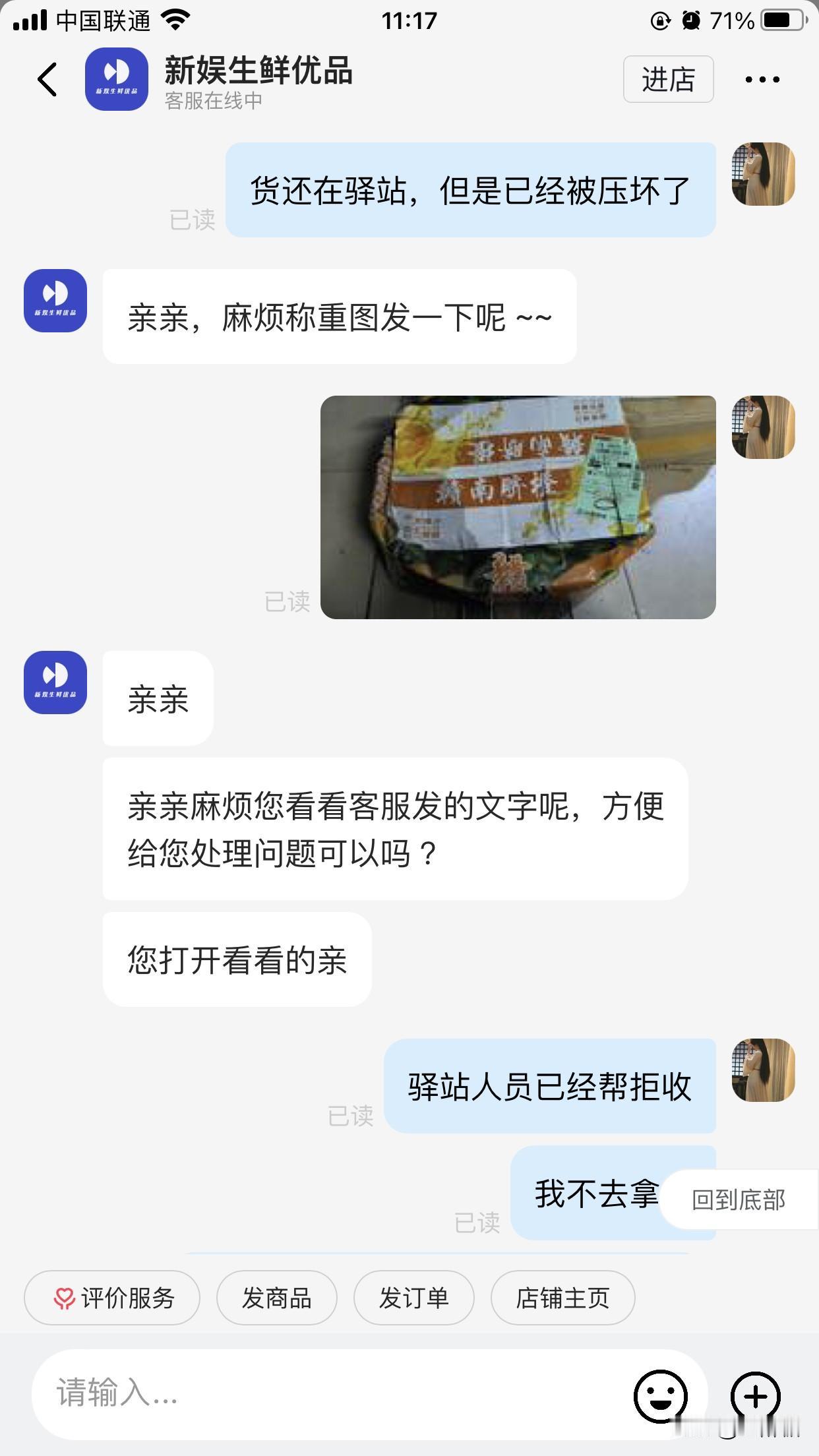 昨晚驿站人员拍了视频和照片给我, 驿站人员说一箱果都是坏的, 我把照片发给客服