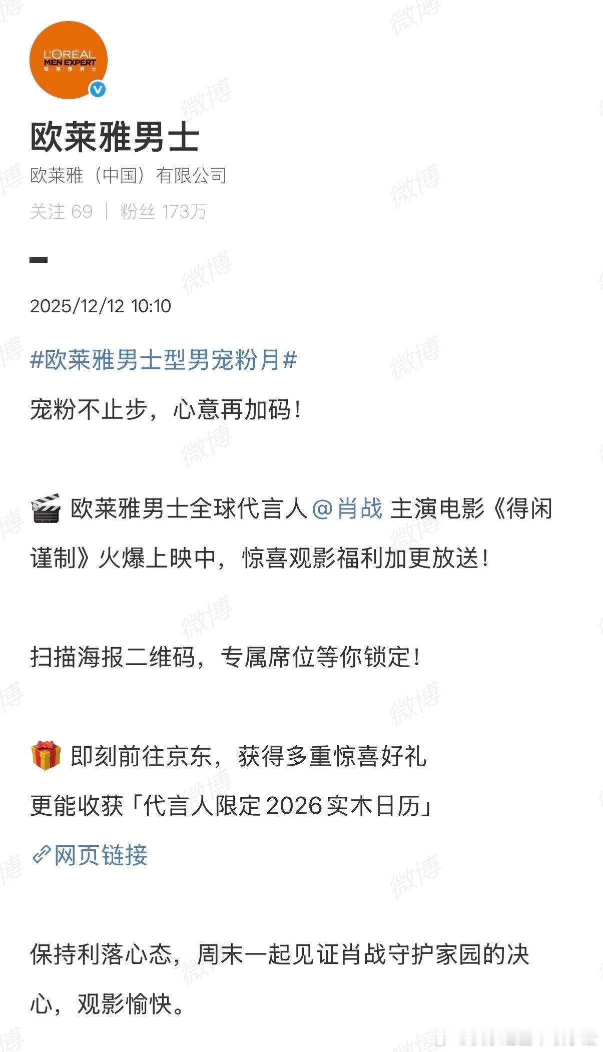 欧莱雅男⼠全球代⾔⼈肖战 1005场!支持为全球代言人肖战新电影打call,品牌霸霸的宠爱就是这么实在~稳稳的TOP1,太厉害啦如此暖心的品牌猛男,双十二可以支持起来啦欧莱雅男士包场1005场