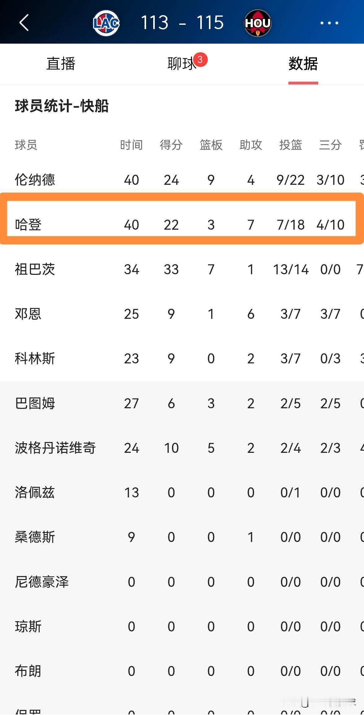 快船当家后卫哈登真是太懂事了!在今天快船客场以113:115惜败于火箭的比赛中,哈登面对旧主不忍心痛下杀手,他在首发出战的40分钟里,投篮18中7,其中三分球10中4、罚球5中4得到22分,还出现了4次失误。 本场比赛,哈登的进攻效率真是太低了,他出手18次仅仅得到22分,由此可见哈登对老东家真是太心慈手软了。