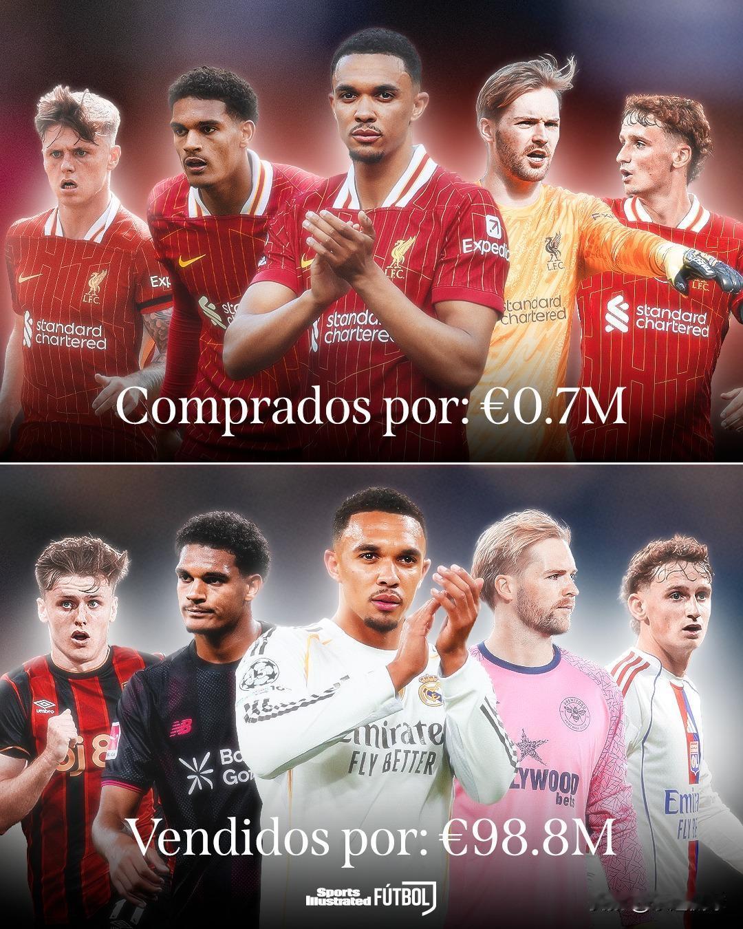 利物浦的青训也开始赚大钱了,这到底是因为青训开始发力了?还是因为谈判团队变强了? 夸安萨:0成本引进→3500万加盟勒沃库森。 本多克:71万欧元引进→2320万欧元加盟伯恩茅斯。 凯莱赫:0成本引进→1480万欧元加盟布伦特福德。 莫顿:0成本引进→1000万欧元加盟里昂。 阿诺德:0成本引进→1000万欧元加盟皇家马德。 这五位青训小将引进时仅花了不到100万欧元,却带来了近1亿欧元的收入。利物浦的青训在克洛普来到后,也发生了翻天地覆的变化。