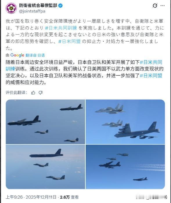 美军出动轰炸机,想给高市早苗撑腰?可惜这次解放军没给面子,派出的阵容,让日本的F-15J连靠近的机会都没有!   中俄第10次联合空中战略巡航的警示声还没散去,美军就急不可耐地跳了出来。   2025年12月10日,两架B-52战略轰炸机在日本海上空盘旋,摆出了一副要为日本“出头”的架势。   美军太平洋司令部说得冠冕堂皇,称这是为了“展示战备状态”,强化美日同盟的威慑力。   日本防卫省也跟着附和,说是为了“阻止单方面改变现状”。   说白了,这就是做给高市早苗看的。   这位日本首相近来正极力推动防卫预算增加到GDP的2%,美国的行动,无异于是在给她打气,鼓动日本在挑衅中国的道路上走得更远。   但美日这番操作看着热闹,明眼人都看得出,这更像是一场政治作秀。   派出的兵力,无论是美国的B-52,还是日本的F-15J战斗机,都暴露了其色厉内荏的本质。   B-52是服役超过半个世纪的“老爷机”,F-15J也飞了四十多年。用这种老古董来亚太地区示威,本身就显得底气不足。   在今天中国的防空体系面前,B-52这种毫无隐身能力的大型目标,和“靶机”没什么两样。   有人或许会说,日本还派了3架F-35。   但在中国日趋成熟的反隐身体系面前,F-35想来去自如,恐怕也只是理论上的可能。   更何况,这次美日演习的空域选在日本海,而不是更敏感的东海,本身就暴露了其战略上的犹豫。   反观中俄12月9日的联合巡航,那才是实打实的战力展示。这次巡航的阵容,可以说是一次前所未有的升级。   中国派出了2架轰-6K、8架歼-16重型战斗机,以及首次成体系参与的空警-500A预警机。   俄罗斯方面则是2架图-95MS战略轰炸机、1架A-50预警机和2架苏-30SM战斗机。   双方的预警机、战斗机、轰炸机协同行动,形成了一个完整的指挥-打击一体化编队。   这套组合拳打出来,意义完全不同。   尤其是空警-500A的加入,让整个编队拥有了强大的态势感知和指挥能力,实现了从“简单伴飞”到体系化作战的跨越。   日本航空自卫队紧急升空应对,但他们面对的局面相当尴尬。   8架满载弹药的歼-16重型战斗机,为轰炸机提供了全程护航。这些歼-16可不是吃素的。   它们挂载的霹雳-17远程空空导弹,射程超过300公里;而霹雳-15的射程也达到了200公里。   这意味着,日本的F-15J战斗机还没进入有效攻击阵位,就可能已经被歼-16锁定。   面对这种绝对压制,日本的F-15J根本没有机会靠近中俄轰炸机编队,只能在远处监视,然后眼睁睁看着中俄编队按计划路线巡航。   这无疑是对日本航空自卫队的一次沉重打击。   中俄编队此次的航线也极具深意。   机群经对马海峡进入东海,再穿过宫古海峡进入西太平洋,一路北上,最远抵达了日本四国岛以东空域,距离东京仅约700公里。   这个距离,意味着中俄的远程打击半径已经能够覆盖日本全域。   更值得注意的是,同一时期,中国的辽宁舰航母编队正在宫古海峡以东海域进行训练。   空中巡航编队与海上航母编队遥相呼应,形成了对琉球群岛的“三方向包围”态势。   这个信号再明确不过了,就是警告日本不要妄图突破和平宪法,不要在危险的边缘试探。   对于这次行动,中国外交部发言人郭嘉昆在12月11日明确表示,这属于中俄年度合作计划,不针对第三方,并要求日方“勿对号入座”。   这种外交辞令的背后,是强大的军事实力做后盾。   俄罗斯的表态则更为直接。俄安全会议秘书绍伊古在12月10日就警告,警惕“日本军国主义抬头”的危险趋势,并对日本提升防卫预算表达了明确反对。   美国的算盘打得很精。它希望把日本推到前台,充当对抗中国的代理人。   近期在日部署射程覆盖中国沿海的“堤丰”中导系统,就是这一策略的体现。美国想让中日陷入消耗,自己则坐收渔翁之利。   但北京的决策者显然看得更远。   中国的目标可能早已超越了单纯的台海问题,而是着眼于一次性解决南海、日本、琉球、台湾等一系列问题的“大战役”准备,绝不会轻易被美国拖入一场代理人战争的泥潭。   这次美日所谓的联合训练,更像是一次心虚的“找补”。   而中俄的联合巡航,则是一次实战化程度极高的战略威慑行动,清晰地展示了中俄两国协同行动、拒止外部干预的坚定决心和强大能力。   12月11日,中国外交部再次敦促美日停止破坏地区稳定的行为。   而绍伊古也放出话来,如果美日继续扩大演习,俄方将采取“军事技术反制”措施。