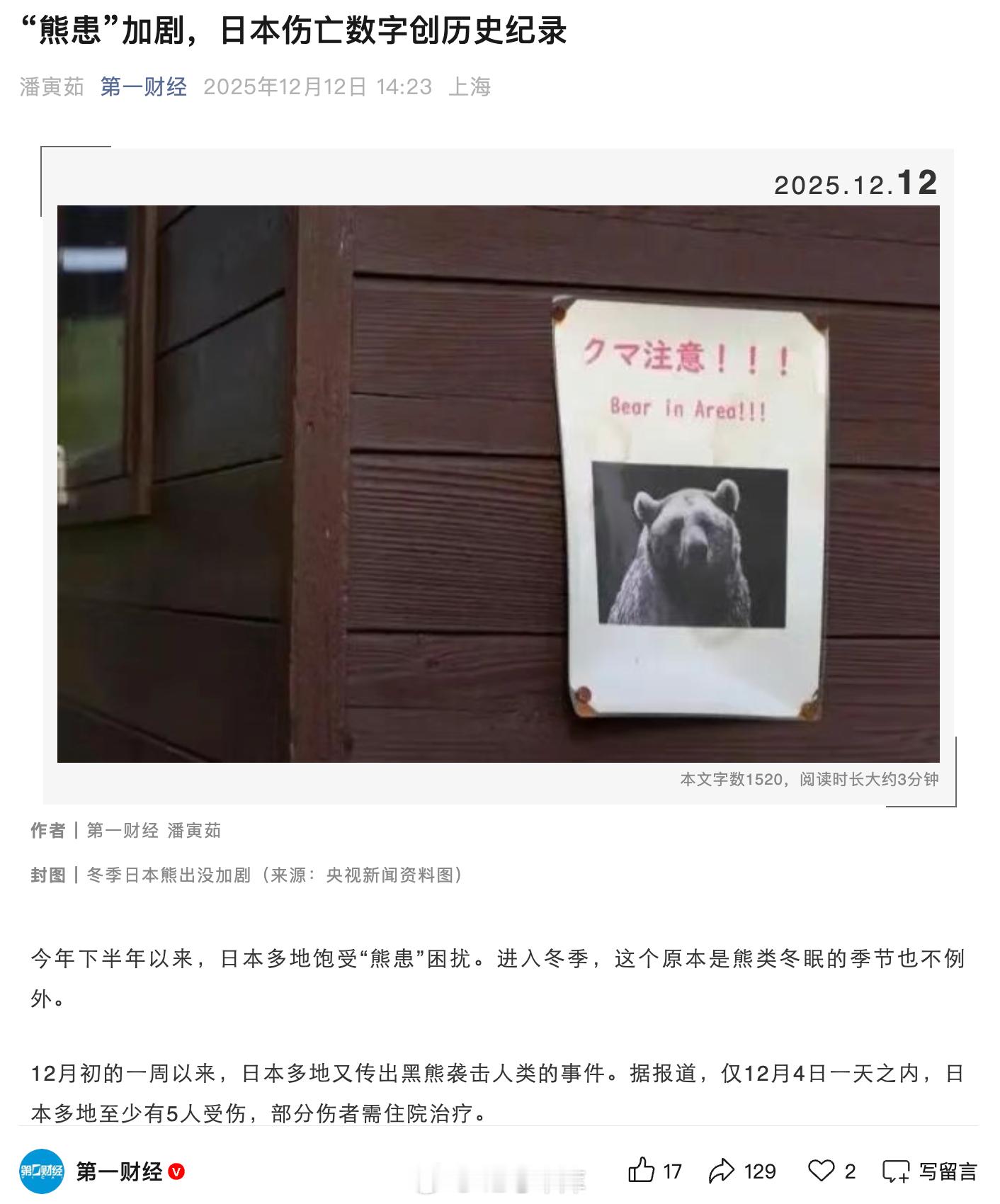 日本熊患加剧,今年 4 月至今,日本全境内至少有 235 人遭到熊袭击受伤,其中 13 人死亡,伤亡数字均创历史新高。进入冬天了,🐻也没消停,仅 12 月 4 日一天之内,日本多地至少有 5 人受伤。喜欢冬天去日本滑雪的朋友注意安全42how新能源汽车日本熊患