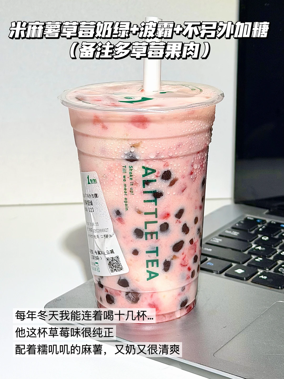6️⃣米麻薯草莓奶绿+波霸+不另外加糖(备注多草莓果肉)