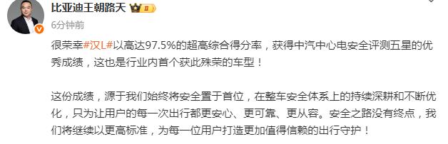 汉L以高达97.5%的超高综合得分率,获得中汽中心电安全评测五星的优秀成绩,这也是行业内首个获此殊荣的车型! 先别管销量如何,比亚迪造车确实时刻把你的安全放到心上。 希望以后出海能有个好销量吧,给海外消费者一点超级e平台,30000转电机的震撼。 比亚迪的汉ip好像并不怎么急着出海,不清楚原因。 按理说出海对抗凯美瑞,特斯拉,甚至56e最起码34c从实力角度是可以的。