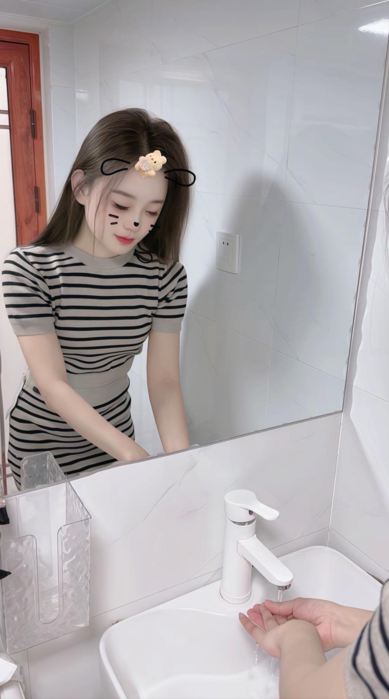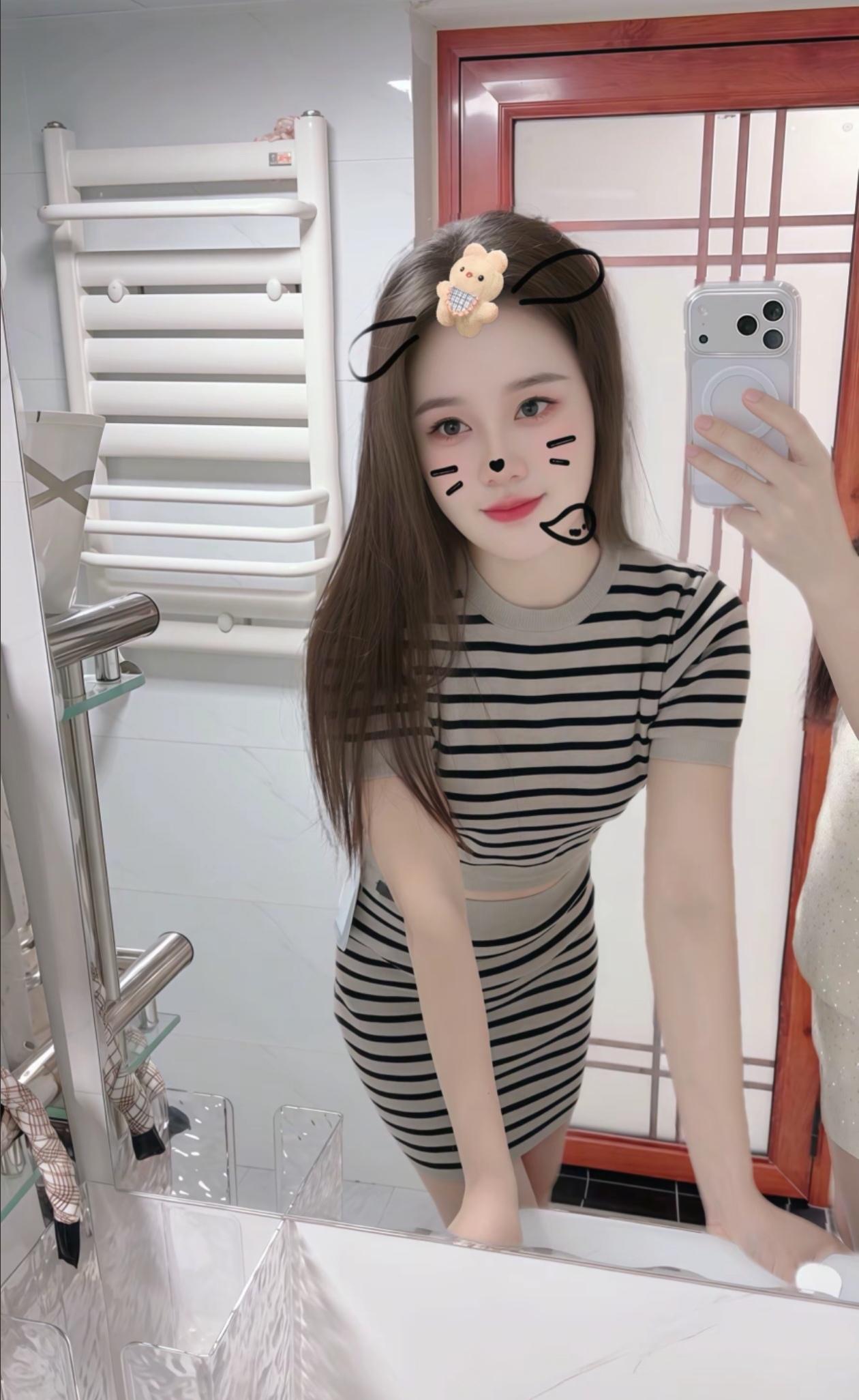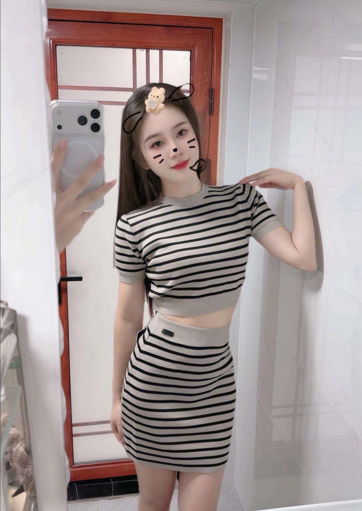T恤紧身黑纹搭配包臀裙,又甜又美