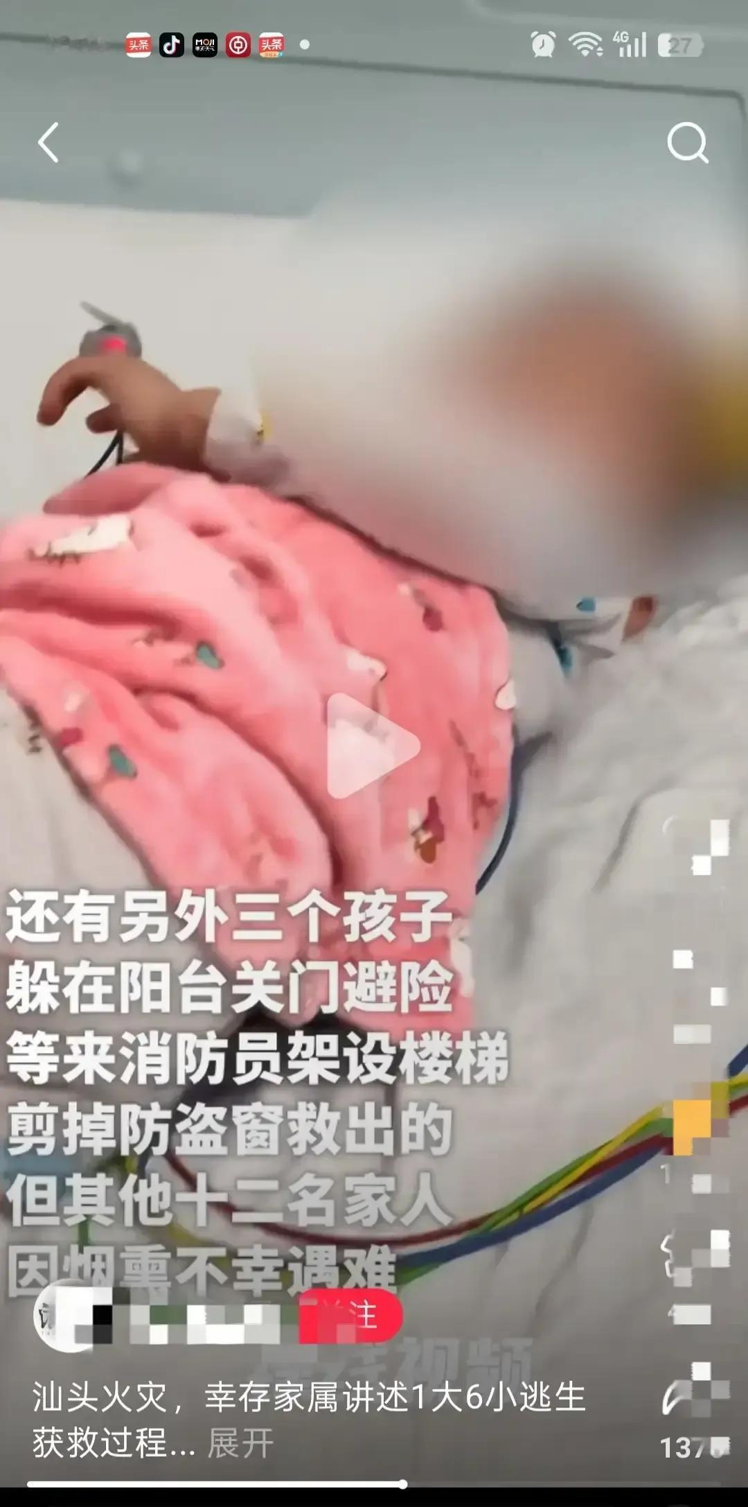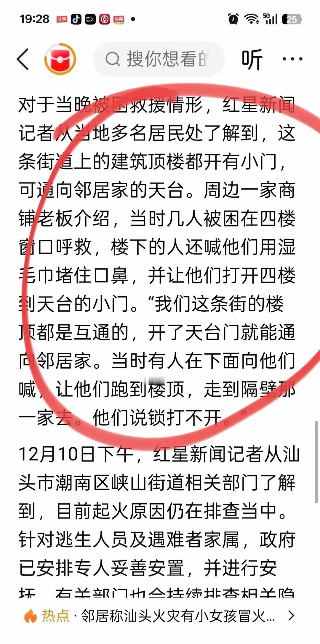 汕头一栋自建房半夜起火,浓烟从一楼蹿到三楼。 一位妈妈叫醒六个孩子,挨个往阳台推,自己最后才出来。 大女儿才十几岁,带着弟妹蹲在栏杆边哭也不乱动,消防员架梯子把小的先抱下去。 可四楼往上的人就没这么幸运,通往楼顶的铁门被一把锁死死卡住,想上天台躲烟的人全被堵在楼梯口,消防赶到时只能破窗往里冲,最后抬出来的几个已经没了呼吸。 邻居说那扇门平时就锁着,钥匙不知在谁手里,说了多少次没人管,现在真出事了,五条命换一句“正在调查” 生命通道被锁,就是把人往火坑里推。 别让下一场大火再来教这条道理。