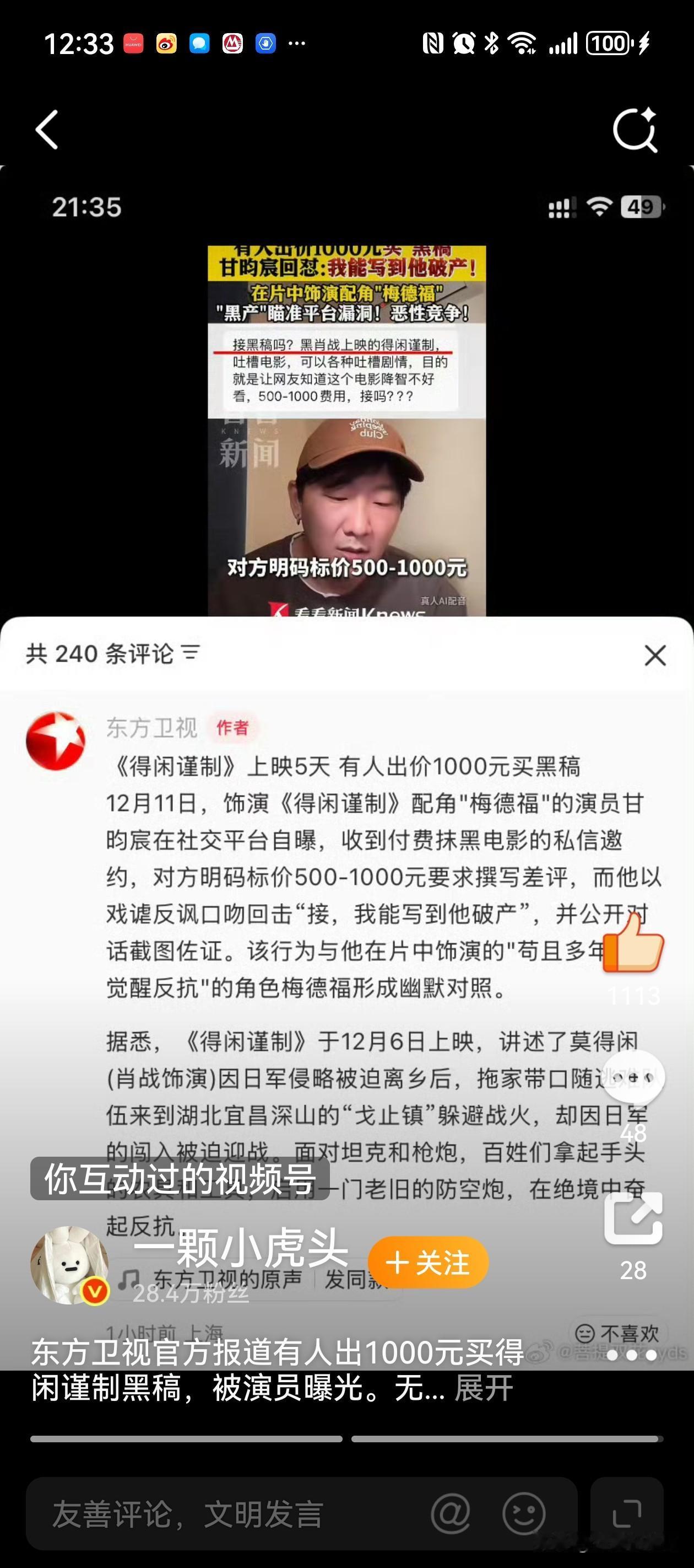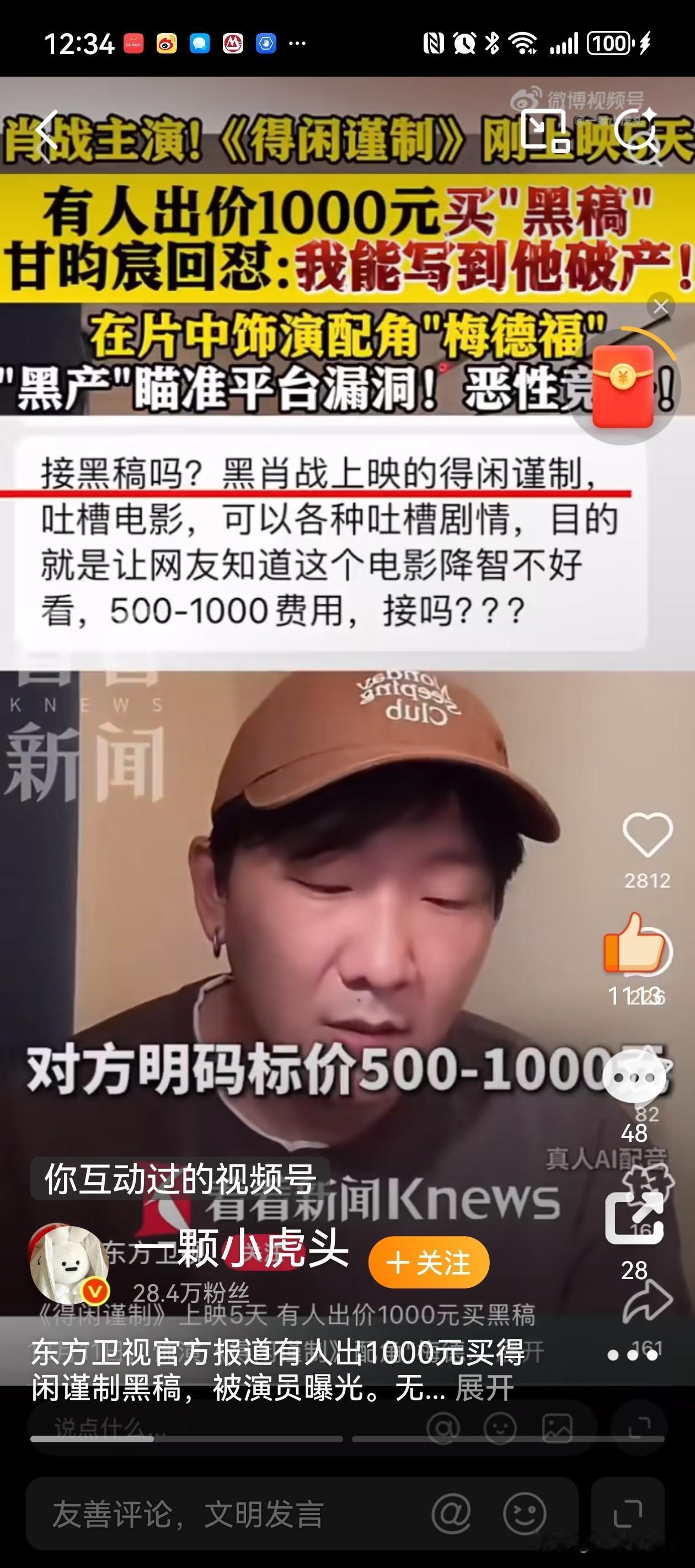 东方卫视曝光黑水军给电影《得闲谨制》买黑稿,出价1000元一篇黑稿,甚至这种约黑稿的私信都发到了得闲谨制一个配角演员那里。优秀抗日片发黑通稿跟汉奸有什么区别。不过不奇怪,给《得闲谨制》豆瓣打差评一星的都是大量的海外IP,这是有多怕中国人抗日啊,这段历史和耻辱必须铭记。永远不能遗忘新电影得闲谨制 明天公祭日,我会再走进电影院观看,难得一见的好电影,必须支持,不允许海外势力抹黑[加油]