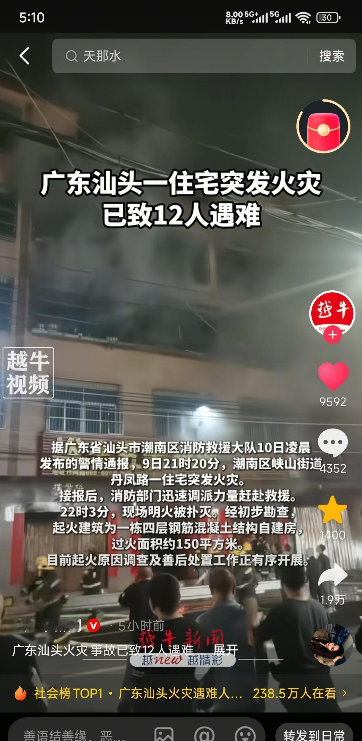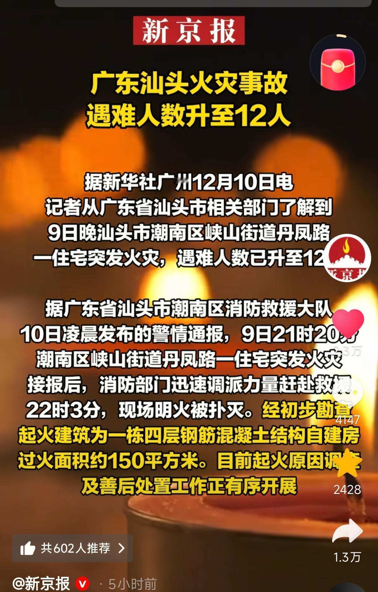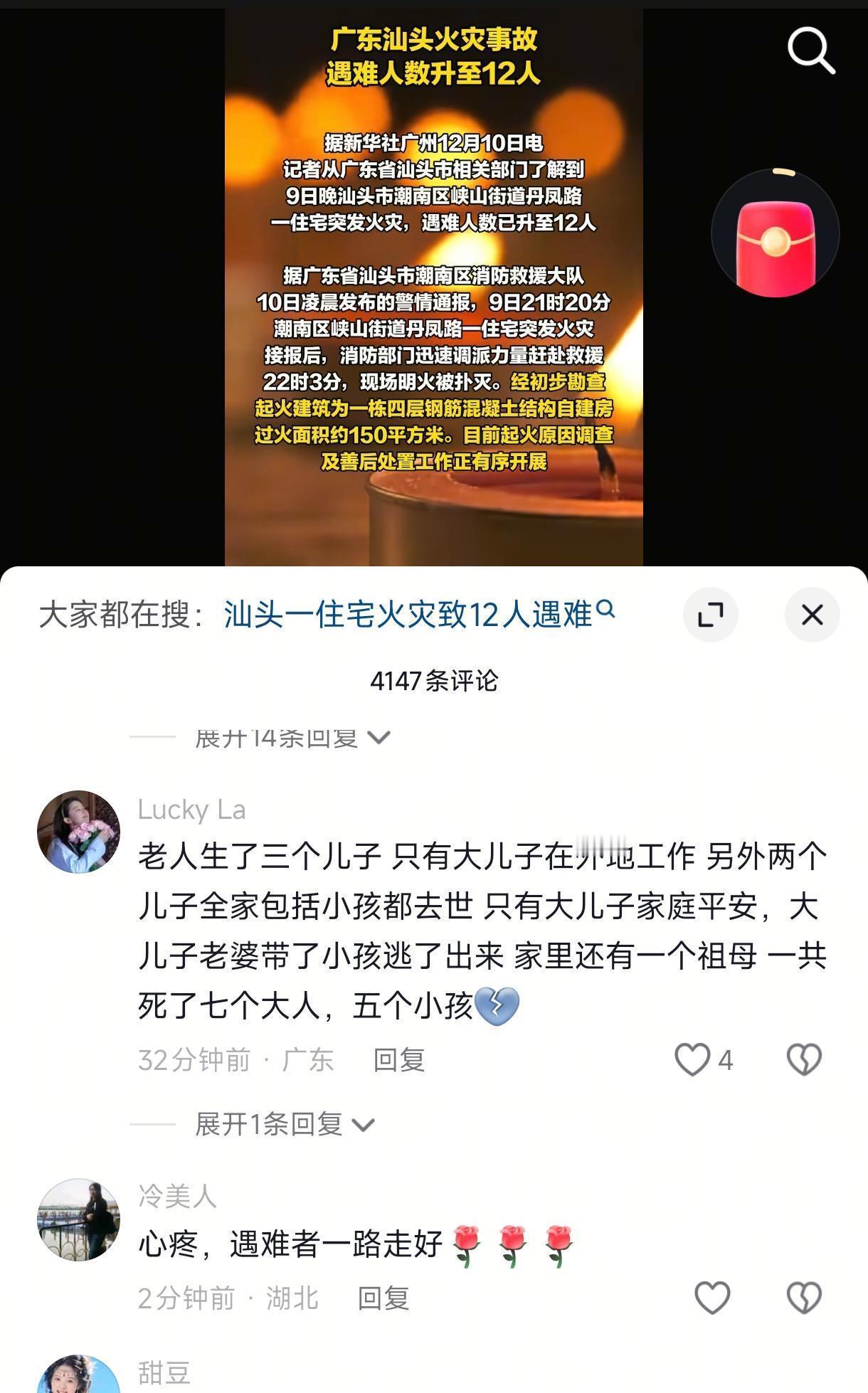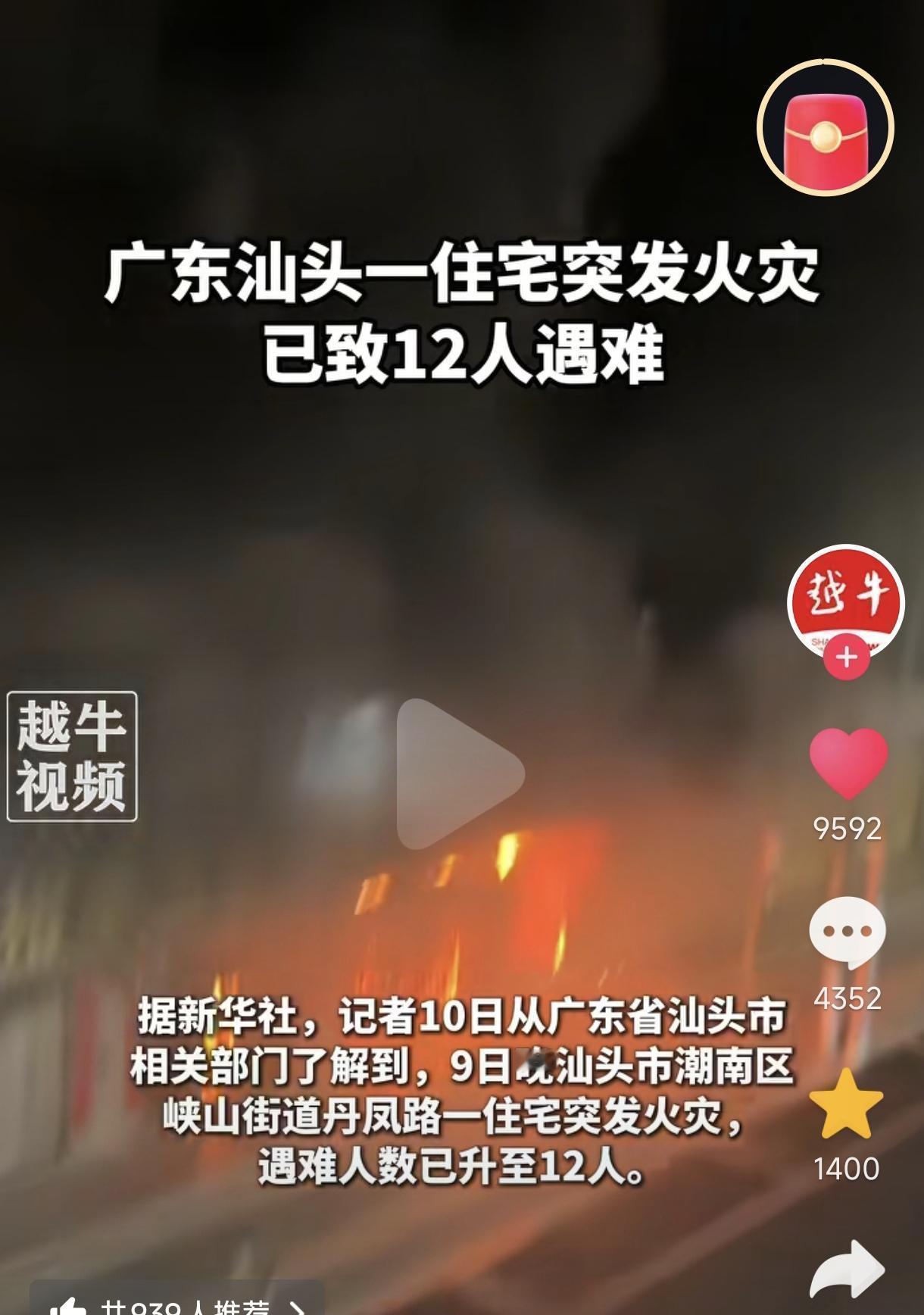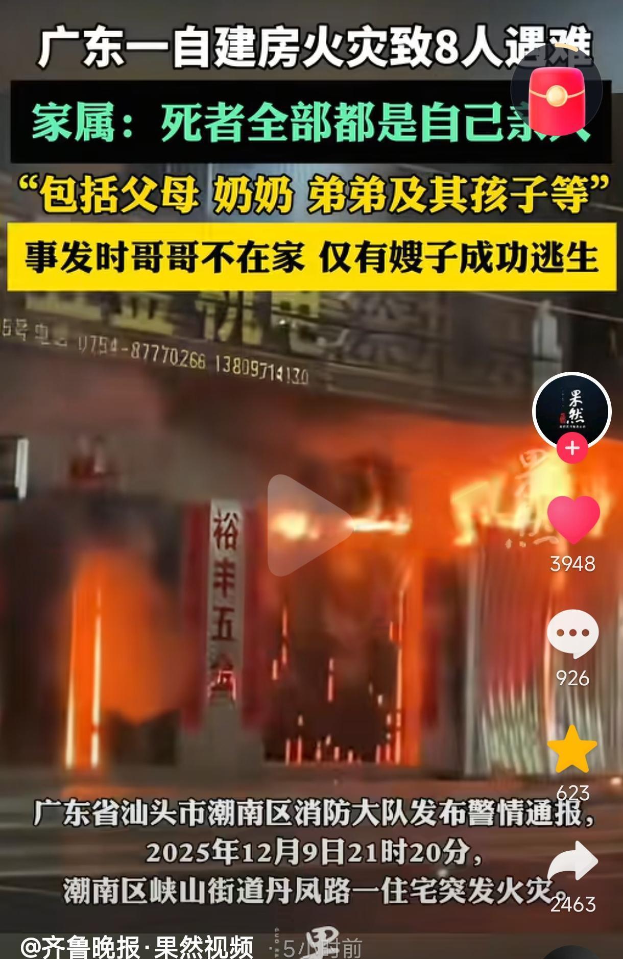 太惨了!一家四代同堂12口人包括奶奶、父母、儿子及其孩子全部死于大火之中! 万幸的是:大儿媳与其四个儿女逃生成功! 浓烟裹着焦糊味窜进二楼卧室时,大儿媳陈女士正给最小的儿子掖被角。 她抓起枕边的湿毛巾,一把捂住孩子口鼻,另一只胳膊夹起另一个儿子,冲到大女儿房间踹开门——两个戴口罩的女孩已吓得缩在床角。 “跟我跑!”她吼着将孩子推出房门,自己殿后,沿着被浓烟熏黑的楼梯往下冲。 200米外,邻居林伯看到火光时,吴家四层小楼的一楼已燃起半米高的火苗。 “五金店着火了!”他边喊边拨打119,此时是12月9日21时23分——距离消防部门接警仅过去3分钟。 消防车呼啸而至时,整栋楼已被火光吞噬。 水枪喷射的水柱撞上卷帘门,腾起的蒸汽模糊了窗玻璃后晃动的人影。 22时03分,明火被扑灭,但消防员破拆防盗窗进入时,楼梯间已堆满昏迷的老人和孩子。 最终,8人当场无生命体征,4人送医后因吸入性损伤过重离世。 12条生命,从82岁的祖母到仅1岁的幼童,跨越四代,一夜之间化为灰烬。 幸存的只有远在东莞打工的大儿子和大儿媳一家六口。 “他们兄弟仨为人实诚,五金店开了十年,从没跟人红过脸。”隔壁杂货店老板叹着气说,出事前一天,三儿子还帮他免费修过电闸。 为何深夜起火却难以逃生? 一楼三间铺面堆满了电气配件和泡沫包装材料,这些易燃物在短路火花中瞬间爆燃。 更致命的是,商铺与居住区之间没有砌实体墙,仅用一道玻璃推拉门隔开,浓烟顺着楼梯间往上蹿,30秒就灌满二楼。 “防盗窗是前年新装的,为防贼,连个透气孔都没留。”参与救援的消防员指着扭曲的钢筋护栏,“我们用液压钳剪了15分钟才打开一个缺口。” 这种“前铺后宅、下店上住”的格局,在潮汕乡镇并不少见。 村民为节省成本,往往将一楼商铺与二楼居住区打通,仅用卷帘门隔开,却不知这道帘幕在火焰面前形同虚设。 火灾发生在夜间,楼上住着7位老人妇孺,他们的卧室都朝着内侧天井,窗外是封死的防盗窗,唯一的楼梯被烟火封堵,逃生之路早已断绝。 陈女士的果断成了全家唯一的光。 她事后回忆,平时总听丈夫说店里材料易燃,便养成了睡前在床头备湿毛巾的习惯;孩子们的口罩,是疫情期间留下的“应急储备”。 “如果当时犹豫一秒,可能就被浓烟呛晕了。”她抱着劫后余生的孩子,声音仍在发颤。 秋冬风燥,年关将近,乡镇商铺的仓库里堆满了待售年货,电气线路也因负荷增大隐患丛生。 这场大火烧掉的不仅是一个家庭,更该烧醒每个人:防盗窗留扇逃生门,商铺与住家砌道实体墙,睡前检查一遍电闸——这些看似琐碎的细节,或许就是生死之间的距离。 逝者已矣,生者当戒。