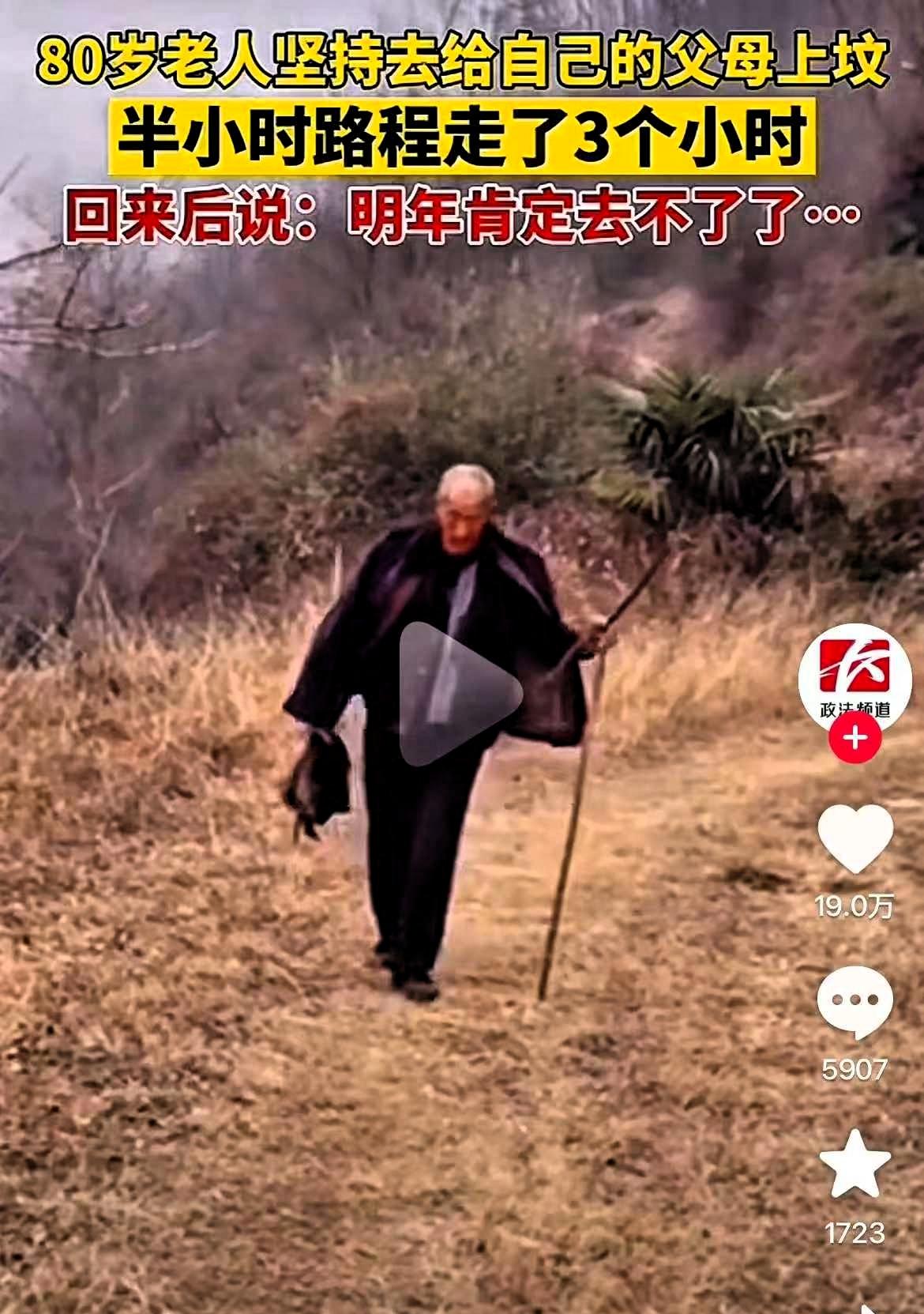 80多岁的老人感觉自己活不长了,弥留之际,他想去给父母上最后一次坟 原本半小时的路程,他足足走了三个多小时。那句轻轻的“爹、娘,我来赴约了”,没有惊天动地的煽情,却让无数人湿了眼眶。 小时候跟着爸妈上坟,只觉得是走个过场,不耐烦地催着返程,不懂那缭绕的青烟里藏着什么。等自己长大,牵着孩子的手踏上同一条山路,才恍然醒悟,这不是简单的祭拜,而是一场跨越生死的血脉对话。 父母在时,我们永远有退路,不管在外受了多少委屈,转身就能扑进他们的怀抱;父母不在了,我们就成了无枝可依的树,连思念都只能对着墓碑喃喃自语。 上坟从来不是迷信,而是中国人独有的寻根方式。那些没来得及说的抱歉、没做到位的孝顺,那些藏了半辈子的牵挂,都能借着这缕缕青烟,传递给另一个世界的亲人。 我们总习惯把尽孝推到“以后”,总觉得时间还很多,可岁月从不会留情,子欲养而亲不待的遗憾,一旦落下就再也无法弥补。 孝顺从来不是什么宏大的誓言,不过是多打一个电话,多回一趟家,多陪他们吃一顿热气腾腾的饭。别等失去了才追悔,趁当下,把能给的温暖都递到父母手边。