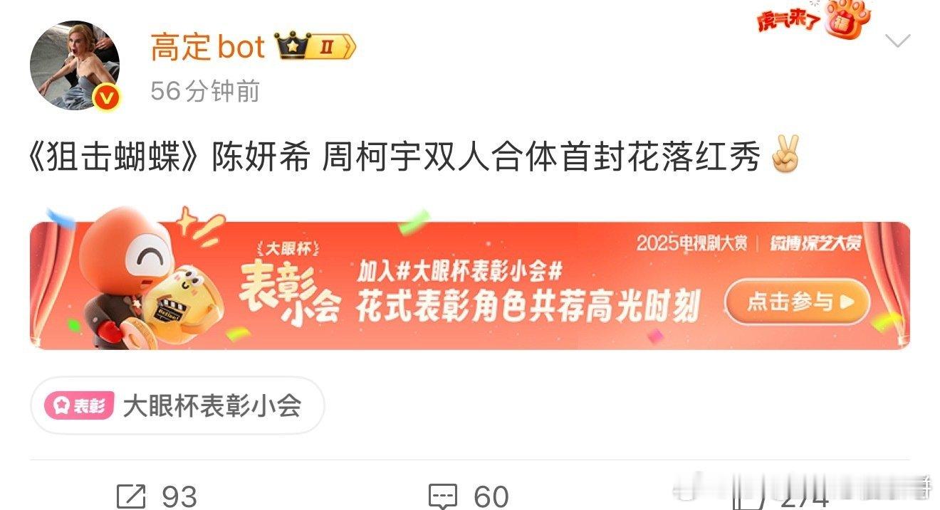 恭喜陈妍希、周柯宇《狙击蝴蝶》腾讯站内热度破26000