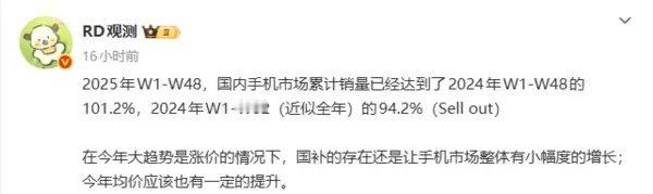 【截至第48周 国内手机市场累计销量达去年同期的101.2%】数码博主RD观测称,2025年1-48周,国内手机市场累计销量已经达到了去年同期累计销量的101.2%。并且,接近2024年1-52周(近似全年)的94.2%。该博主认为,在今年手机市场大趋势是涨价的情况下,国补的存在还是让手机市场整体有小幅度的增长;今年均价应该也有一定的提升。不同品牌在补贴政策下的表现呈现明显分化。截至第48周,头部品牌对比去年全年的完成度呈现阶梯式分布:苹果已达101.01%,小米为99.69%,vivo则为91.44%。苹果率先超过去年全年水平,显示出其在高端市场的稳固地位和消费者忠诚度。小米紧追其后,即将完成全年目标,表现强劲。vivo虽在三大品牌中完成度相对较低,但旗下iQOO子品牌表现亮眼,完成度达96.47%,显示出在细分市场的竞争力。CNMO还了解到,华为在2025年第二季度以18.1%的市场份额重回头部位置。其线下渠道国补使用率接近100%,部分机型曾因抢购而断货。市场在补贴推动下增长的同时,手机厂商正面临前所未有的成本压力。全球存储芯片市场自今年下半年进入疯狂涨价周期。TrendForce集邦咨询数据显示,今年第三季度DRAM价格较去年同期大幅上涨171.8%,第四季度预计还将在此基础上再增长45%—50%。存储元器件在手机硬件成本中约占10%—20%的比重。据群智咨询测算,2025年第四季度相比第一季度,存储涨价使手机整体BOM成本增加了8%—12%。尽管当前数据表现积极,但业内对未来市场持谨慎态度。IDC预计,2026年中国智能手机出货量将同比下降2.2%至2.78亿台。