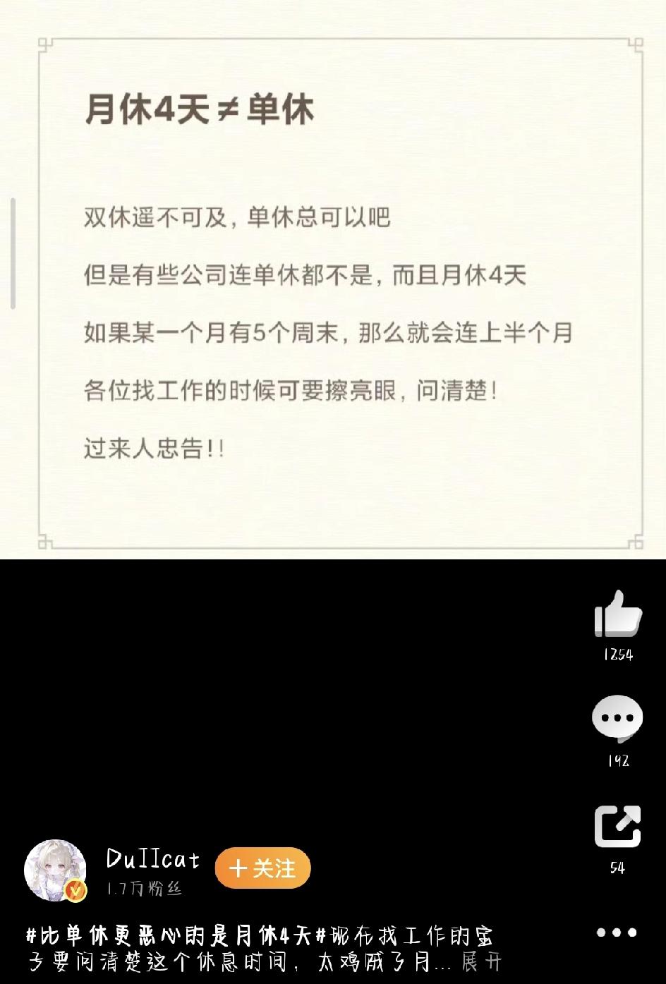 最近比单休更恶心的是月休4天的话题在网上吵翻了,刷到好多打工人的吐槽,真的越看越替找工作的宝子们捏把汗——这看似差不多的休息制度,里面的坑简直能把人绕晕。 以前找工作,问一句“单休还是双休”就够了,现在倒好,“月休4天”成了不少公司的“遮羞布”,乍一听跟单休没差,甚至像多给了福利,实际体验下来才知道有多鸡贼。单休是明明白白的每周休一天,大多固定在周末,就算累,至少心里有盼头,到点就能知道“明天能歇着了”,遇上31天的大月,五个周末还能多休一天,一年下来也能攒下不少完整的休息日。 但月休4天完全是另一个套路,核心就是“一个月就给4天假,多一天都没有”。更坑的是,这4天还不一定是固定的,很多公司都是“灵活排班”或者“调休抵扣”,今天让你周中休,明天让你月底凑着休,甚至可能连续干十几天才给一天假,刚缓过劲来又得接着连轴转。有网友吐槽,自己的休息时间永远和朋友、家人错位,别人周末有空聚会,他得上班,等他休息了,身边人都在忙,一年下来连次完整的聚餐都凑不齐,社交直接断联。 更过分的是那些藏在背后的“算法陷阱”。有些公司按自然月算出勤,大月31天就得出勤27天,比单休还多上一天;小月30天出勤26天,刚够单休标准。还有的把加班时间折算成调休,今天让你多干两小时,说月底抵半天假,真到月底又以“任务没完成”为由往后拖,最后调休单攒了一堆,能休的没几天。最让人崩溃的是,休班时手机还得24小时开机,客户消息、工作群通知不断,刚躺下就得爬起来回消息,等于休了个“假性假期”,还不如不休。 单休虽然累,但固定的周期能让人勉强维持工作和生活的平衡,至少能提前规划陪家人、办琐事。可月休4天的不确定性,会让人彻底没了掌控感。想预约就医、办证件,怕刚好排到工作日休息;想规划短途旅行,又怕临时被喊去上班,长期下来不仅身体累,心里的焦虑感也越来越重。更无奈的是,这种制度还刚好踩在劳动法的边缘,说起来“每周至少休一天”,投诉都没地方说理。 所以现在找工作的宝子们,千万别被“月休4天”的说法忽悠了。面试时一定要追问清楚:休息日是固定的还是随机排?能不能连休?遇到大月怎么算?调休会不会过期?毕竟工作是为了更好地生活,不是为了在“休息陷阱”里内耗。希望更多公司能少点套路,多点真诚,也希望打工人都能守住自己的休息权,不用在“单休”和“月休4天”之间做无奈的选择。 来源:DuIIcat