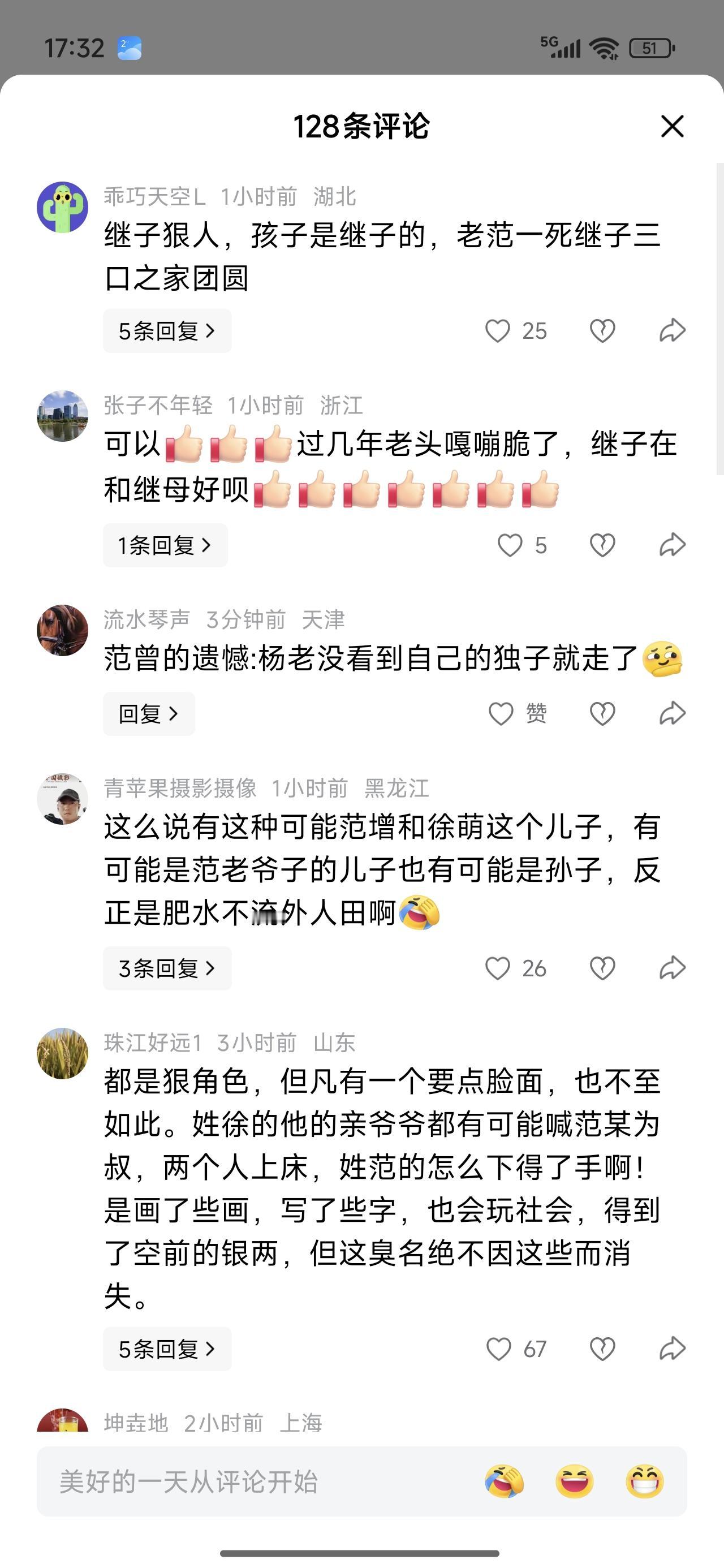 范曾老爷子的小娇妻,原来是继子的旧相识。介绍给自己的继父。继父与她喜结连理。生下一子。 本来也没什么的,嫁给谁不是嫁。你不知我不知,这个精神矍铄的老头儿,手里起码有20个小目标。这下都懂了吧!原来闺女,继子等都有可能分点。一断绝关系。跟咱们一样成看客了,你说头大不头大? 唯一有机会的是继子,因为老头儿一旦嘎嘣脆,继子跟继母还乐意的话,再续前缘。这也算曲线救国了!世上有几个人能收入过亿,有个过亿的爹也没那么靠谱啊!都不如自己有来的过瘾!