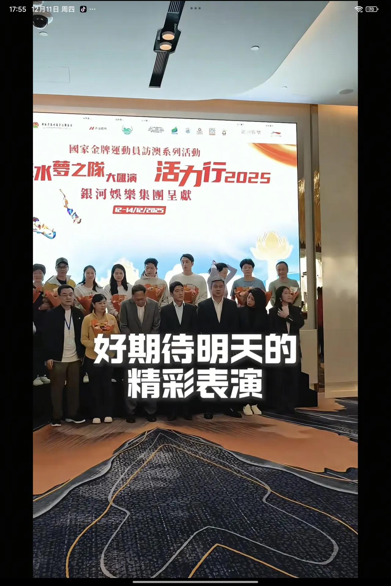 12月12日国家跳水梦之队,活力行赴澳门大汇演,总教练周继红带队,有陈若琳,吴敏霞,何冲,陈艾森,陈芋汐,王艺文,昌雅妮,大家玩的真开心,个个光彩照人,没有全红婵参与的国家队跳队团结友爱欢声笑语详和一片,幸福快乐,当然这不是全红婵的错,是不理性的极端粉丝太多了,这样的粉丝伤害整个跳水队,同样也在伤害全红婵,全红婵发视频说没能参加很遗憾,祝队友们汇演圆满成功。 吴敏霞还带着自己的女儿小宝贝看见陈芋汐高兴扑向陈芋汐,甜甜叫芋汐姐,太可爱了。大家在一起好开心快乐。