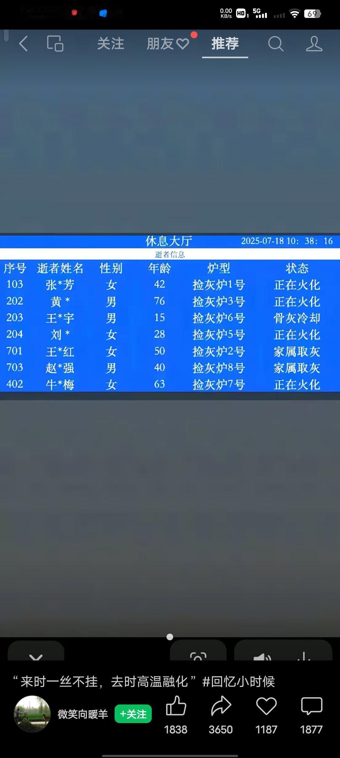看看下面这个火化者的年龄差,你有何感想呢? 原来我们不是老了才会死,而是随时都会死,来的时候是按顺序来的吗?可死的时候为什么不按先来后到呢? 看看这个火花表,七个人之中只有一个是76岁,最小的一个才15岁,15岁呀,多好的年华啊!当看到15岁和28岁时心里真的好疼。突然之间觉得活着真没意思,有人活到了70多岁,有人却在十几岁就死了,这个世界哪里还有公平? 来时一丝不挂,去时高温融化,啥都没有了,来时是自己哭着来的,走时是亲人哭着送自己走的,但是自己哭着来的时候自己也不知道,走时亲人哭的时候自己也看不见。 15岁呀,我的儿子也是在15岁离开的,看着那个表格里15岁的孩子,就像看着我的儿子一样,心里好疼,好疼!