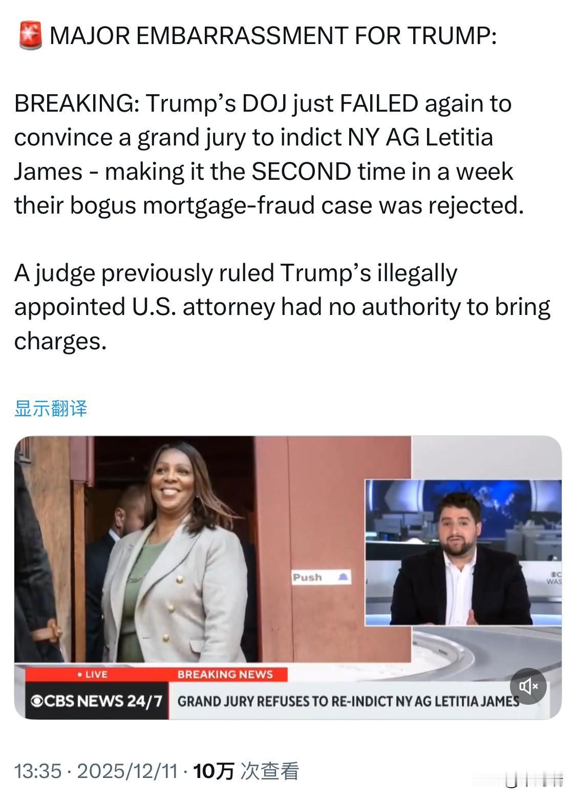 突发新闻:特朗普遭遇重大尴尬,特朗普的司法部再次未能说服大陪审团起诉纽约州总检察长莱蒂西亚·詹姆斯——这是他们捏造的抵押贷款欺诈案在一周内第二次被驳回。 此前,一名法官裁定,特朗普非法任命的美国检察官无权提起诉讼。