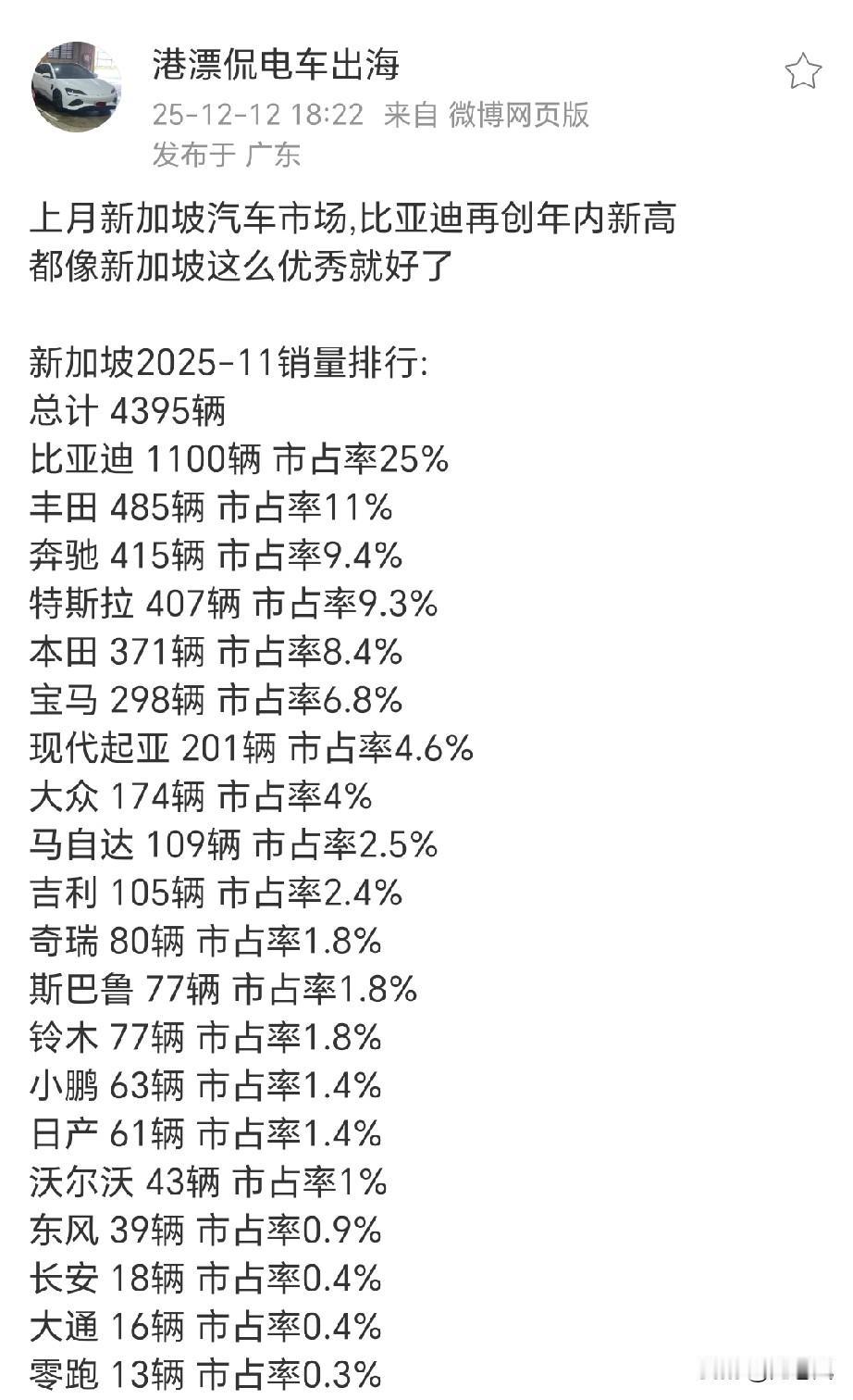 比亚迪在新加坡彻底把丰田打崩了。 11月市占率已经做到25%了比国内高的多,绝对王者[捂脸] 我以前确实以为香港,新加坡消费者会歧视比亚迪,毕竟大陆产的嘛,哪想到人家进去没多久就销冠了啊[笑哭] 比亚迪要在国内做到25%的市占率现在看难度极大了,需要付出艰辛的努力。营销要做极大的战略调整才行 比亚迪销量 比亚迪海外发展
