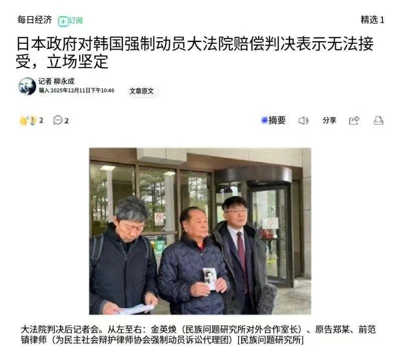 日本拒绝赔偿,并提出一个非常不要脸的方案 昨天(11日),韩国最高法院就“二战时期日本强征劳工赔偿案”作出终审判决,判处日本相关企业赔偿被强征劳工遗属1亿韩元。 然而,日本政府却不接受韩国法院支持受害者的判决,在此前的审判过程中,日本政府多次辩称:《韩日请求协定》“已经解决”了索赔问题,这次仍然死不改口,并表示如果要赔偿,也得通过第三方代付的方式来进行。 所谓的“第三方代付”操作由尹锡悦政府提出,日本之所以支持,就是因为这个“第三方”,是韩国一个名为“日本帝国主义强制动员受害者支援财团”的组织,该组织的大部分资金来源,是韩国企业的无偿捐赠,拿韩国人的钱赔给韩国受害者,日本人真是有点不要脸了。 可能在日本人眼里,这些将他们告上法庭的劳工遗属,想要的只是那笔赔偿款,谁给的都无所谓,但事实上,遗属们最想要的是“公道”二字,是日本人对过去历史罪责的承认。 二战期间,在朝鲜半岛实行殖民统治的日军强征了大量当地劳工,将他们送去日本干苦力,而这些劳工大部分都是有去无回,最终死在异国他乡。 而本案的原告,其父亲就在1940年被日军强征去一家制铁所劳动,而这家制铁所延续至今,改头换面成了“日本新日铁住金公司”。所以,像日本的三菱重工、熊谷组等大企业,发展历程中无不沾满了海外劳工的鲜血。 值得注意的是,二战期间同样有大量的中国劳工被日军掳走,所以我们可以看到,早在20多年前,就有中国劳工遗属以及志愿团体远赴日本(图4),只为讨一个公道,尽管多次在日本政府的阻挠下败诉,但这条路一直到今天还在继续走。 日本人如果想要以拖时间来淡化历史罪责,消极处理历史遗留问题,那最终只会招致国际社会上越来越多的骂名,世界各国对于日本军国主义思想的忍耐阈值也会慢慢降低。