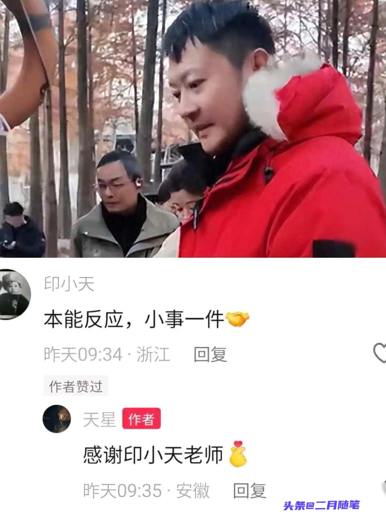 男子称妻子在安徽一景区不慎落水, 被演员印小天从水中救起;印小天本人回复: 本能反应, 小事一件! 你听说了吗? 安徽某个景区有人掉水里了,周围人都愣着的时候, 居然是演员印小天第一个跳下去救人! 没炒作也没造势, 低调得让人心里一暖。 十二月初, 安徽宁国红杉林景区, 文旅推荐官宋先生带着妻子在那儿拍素材, 他妻子不小心踩到松动的栈道掉进了水里。 边上的人都还没反应过来, 印小天已经扔下手机, 一步跨过栏杆俯下身, 五秒钟就把人抱了上来, 还细心递上备用的羽绒服。 确认人没事之后, 他就默默收拾东西离开了。 后来宋先生发了视频感谢, 印小天只在评论区轻轻回了句“本能反应, 小事一件”, 从头到尾没让团队发一句通稿。 原来他是在安徽拍《种墨园》刚杀青, 来景区散心正好碰到这事。 他出身军人家庭, 又有多年舞蹈功底, 反应比一般人快得多。 现在明星做点事总被怀疑是作秀, 他却一声不响做完事, 低调退场。 真没想到, 褪去光环之后, 这种下意识的善良和担当, 才最让人感动! 印小天景区救人暖心瞬间 明星正能量真实写照 社会暖心事件 安徽宁国红杉林安徽救人 江里救人