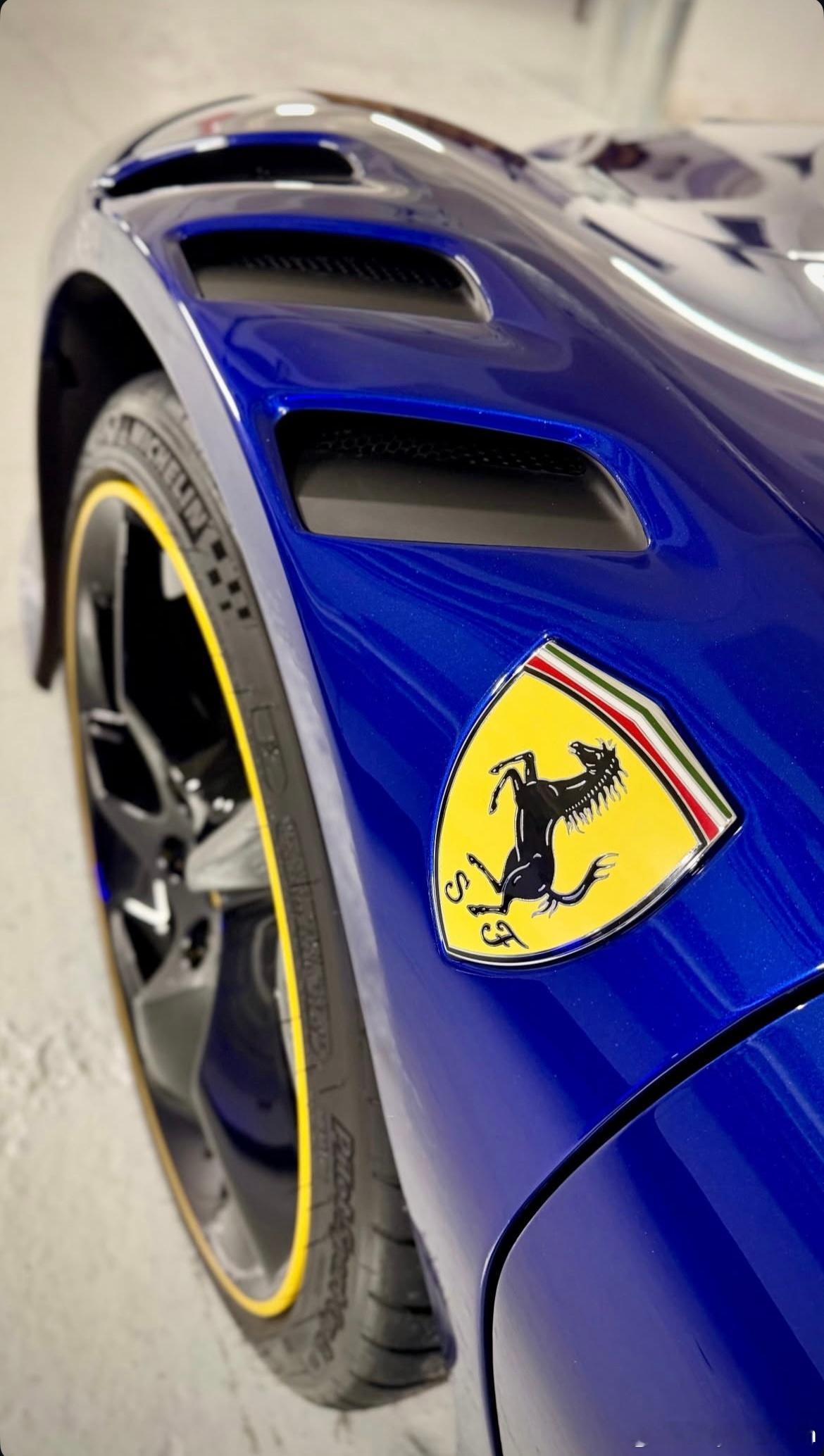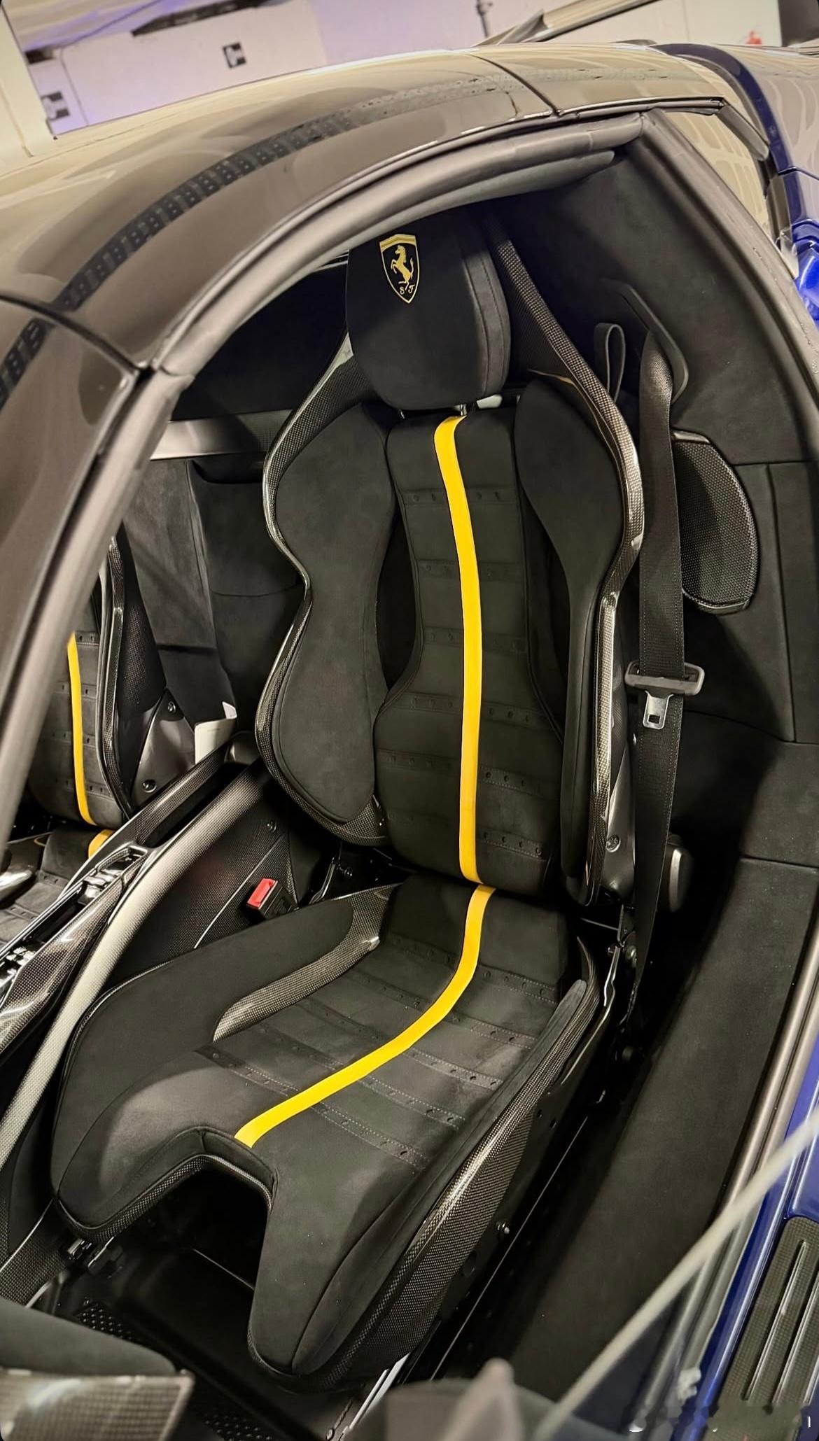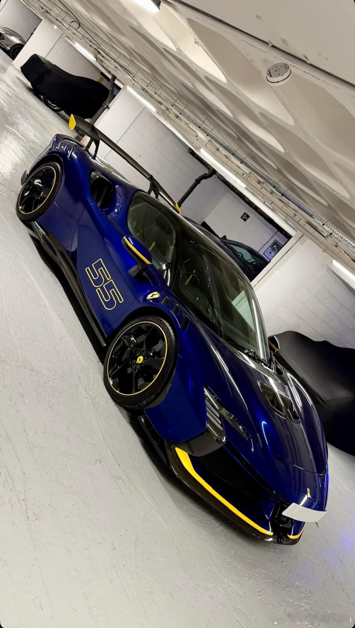 外观配色为Blu Vietri,一款非常罕见的One-off配色,呈现出很深邃的宝石蓝效果。前杠上侧使用了Giallo Triplo Strato进行点缀,同样的颜色还出现在反光镜的中线上,尾翼的两侧以及边长上,此外两侧车门下方还选择了镂空的55号赛车编号。内饰方面,Daytona复古赛车座椅以Nero Alcantara为主,座椅中线为Giallo Leather,黄色的点缀还出现在换挡拨片上。交付于位于英国伦敦的HR Owen Ferrari,如今大部分稀奇的颜色都可以通过Atelier来达到。图片来自