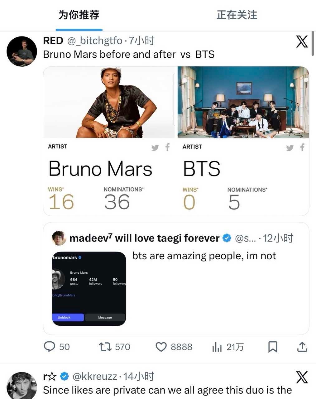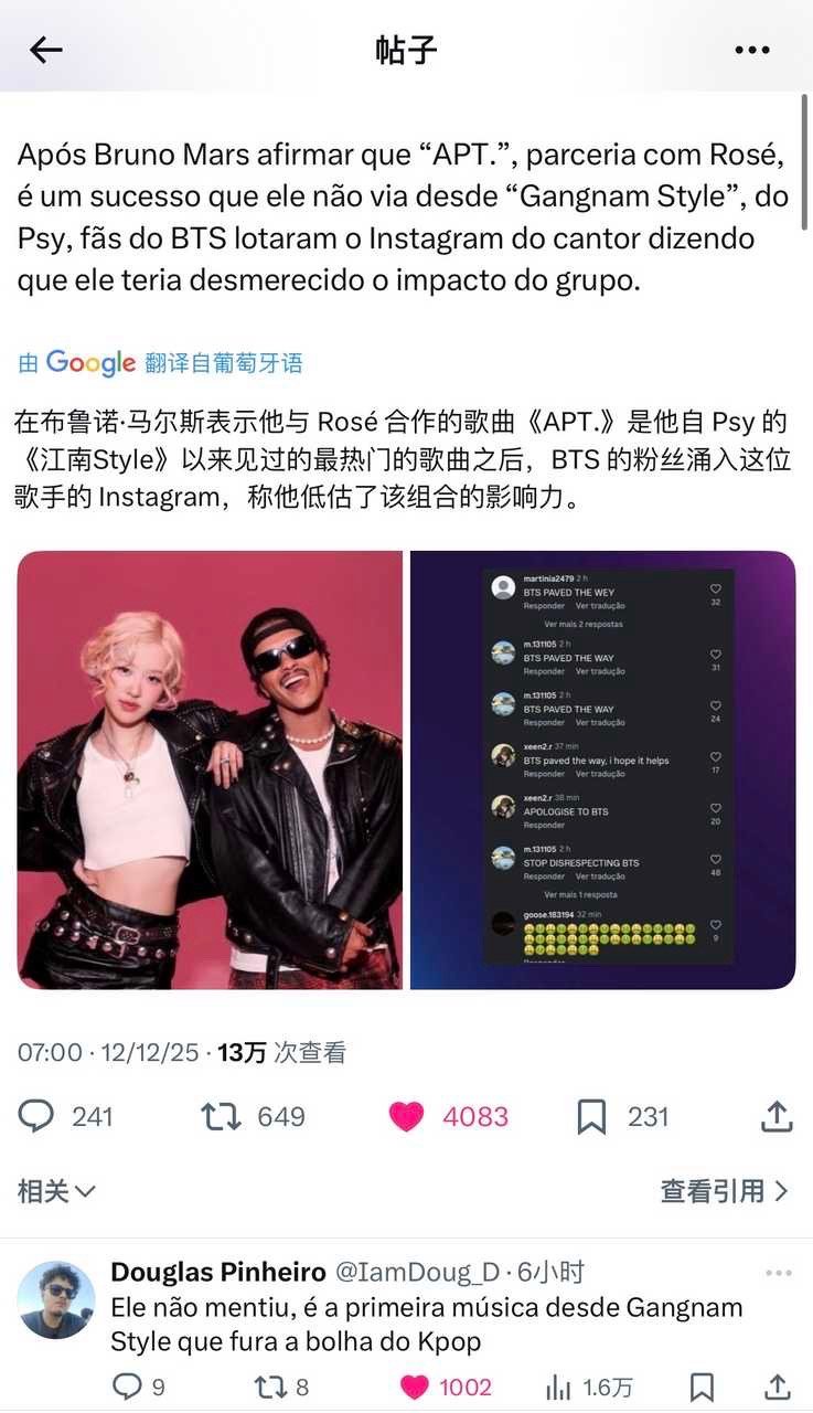 怎么看外网bts粉丝 居然因火星哥说除了《APT.》之外 距上次见到的现象级全球爆曲是《江南style》而不是bts的歌 而破防