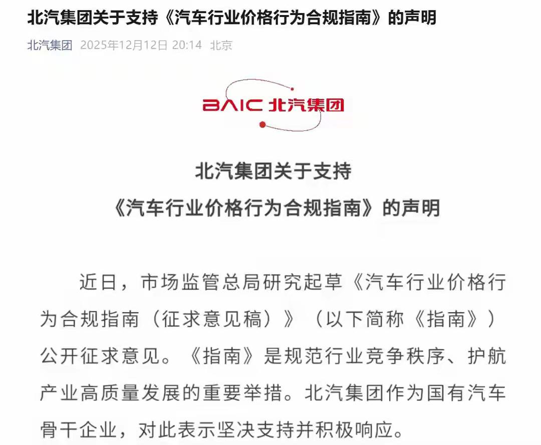 国家市场监督管理总局于2025年12月12日发布《汽车行业价格行为合规指南(征求意见稿)》,面向社会公开征求意见。 核心内容要点: 禁止低于成本价销售:汽车生产企业不得以排挤竞争对手或独占市场为目的,使整车或零部件实际出厂价格低于其生产成本,包括通过折扣、补贴、多发货少开票、招标压价等方式变相降价。 明码标价与透明收费:要求汽车销售企业真实、准确标示车辆及可选配件的价格信息,严格区分产品价格与服务费用,严禁价外加价。 规范促销行为:促销活动需显著公示规则、期限及限制条件,赠品信息应如实标明,杜绝虚假促销。 打击价格欺诈:明确禁止误导性标价、虚假比较、不履行价格承诺等行为。 保障消费者知情权:对“付费解锁”功能等新型商业模式,需提前告知免费期限与收费标准。 禁止价格歧视与串通:不得对同等交易条件的经营者实施差别待遇,严禁企业间价格联盟或串通定价。 比亚迪、小鹏、北汽率先表态,承诺坚决杜绝价格欺诈和不正当竞争行为,支持构建公平有序的市场环境。【来自懂车帝车友圈】