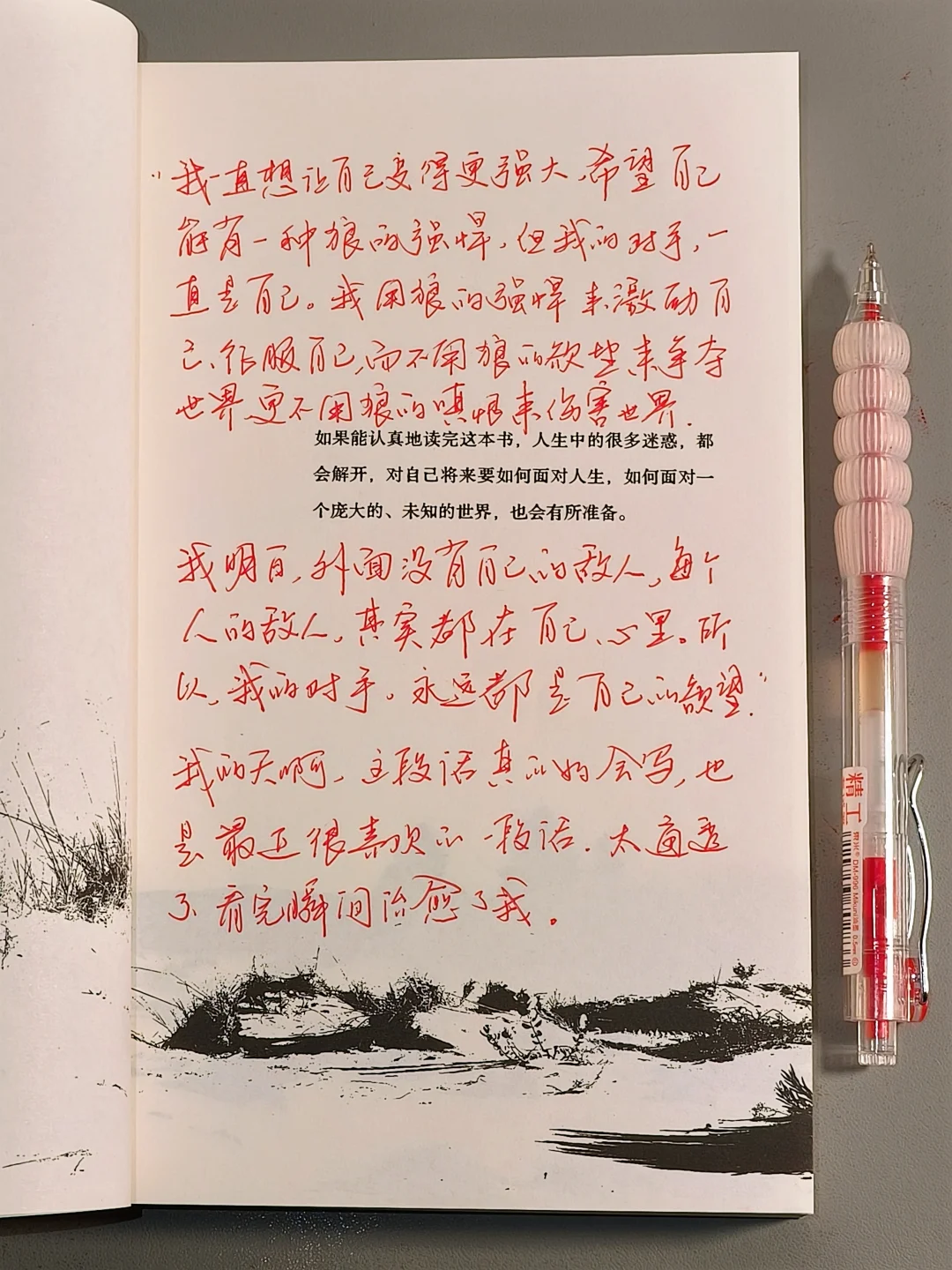“我一直想让自己变得更强大,希望自己能有一种狼的强悍,但我的对手,一直是自己。我用狼的强悍来激励自己、征服自己,而不用狼的欲望来争夺世界,更不用狼的嗔恨来伤害世界。我明白,外面没有自己的敌人,每个人的敌人,其实都在自己心里。所以,我的对手,永远是自己的欲望。我也明白,无论如何贪婪,一切都在飞快地成为记忆,我不愿从贪婪的青年变成贪婪的老人,也不想在人生的桥上建房子,我只想放下一切,平坦了心,升华自己,享受命运里所有的故事,哪怕是一些当时觉得苦涩的事。”