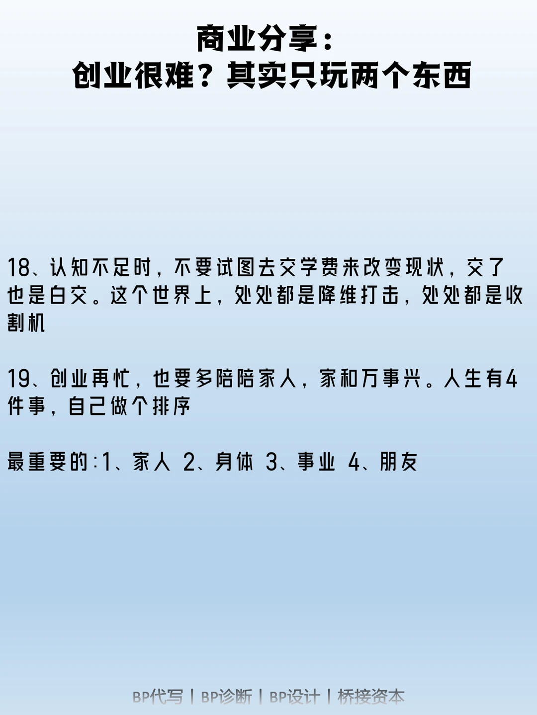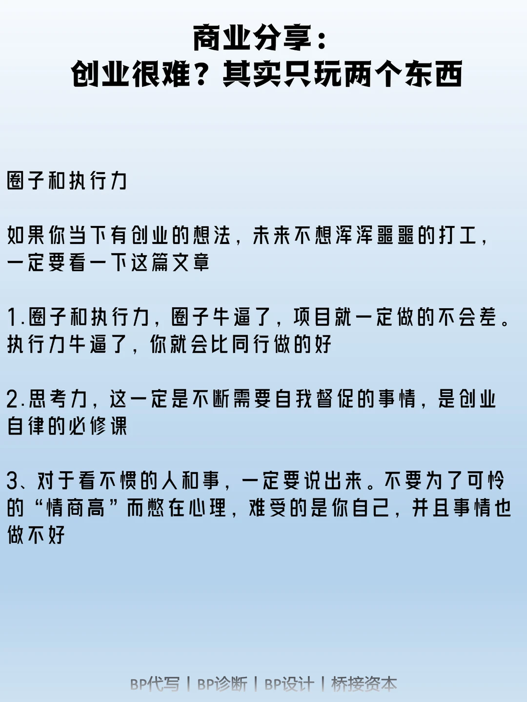 圈子和执行力 如果你当下有创业的想法,未来不想浑浑噩噩的打工,一定要看一下这篇文章 1.圈子和执行力,圈子牛逼了,项目就一定做的不会差。执行力牛逼了,你就会比同行做的好 2.思考力,这一定是不断需要自我督促的事情,是创业自律的必修课 3.对于看不惯的人和事,一定要说出来。不要为了可怜的“情商高”而憋在心理,难受的是你自己,并且事情也做不好