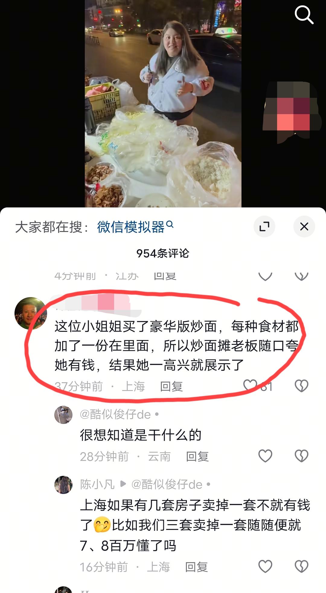 上海,街边买炒面的小姐姐,闲聊期间,随手展示了她微信里面700多万的余额…… 据视频发布者称:事情缘由是小姐姐买了一份豪华版的炒面,炒面摊老板随口夸了她一句“有钱”,小姐姐一高兴就展示了她微信里面的巨款…… 评论区大部分网友表示不信:这么年轻,700多万,还都放在微信“零钱通”里面,而且还这么没有顾忌的向陌生人展示?可能吗?这极大可能用了微信模拟器。 不过,还是有网友表示还是有可能的:不要以我们穷人的认知看这个世界,有钱人的豪横我们根本不懂! 网友们,你们信是不信?