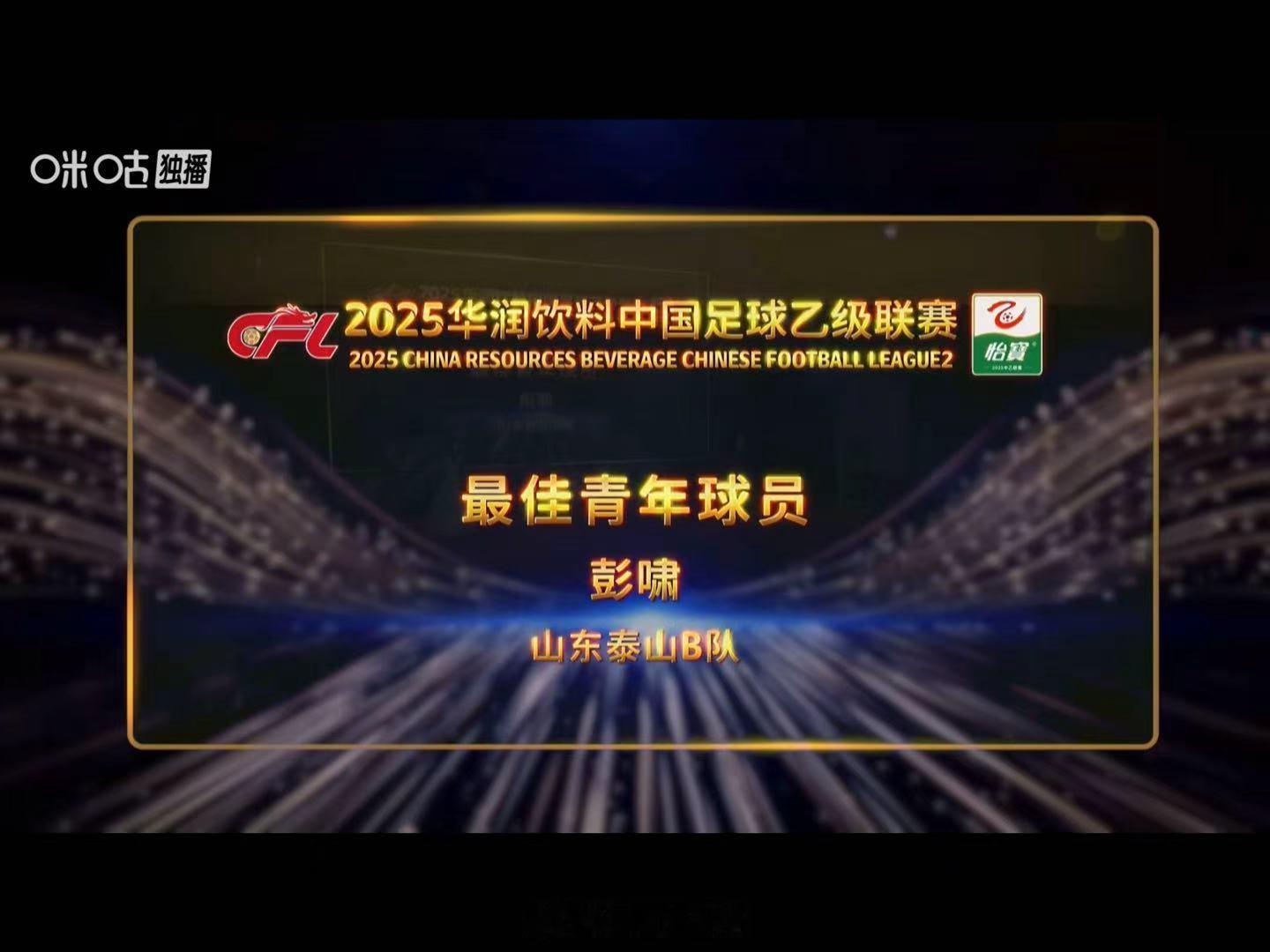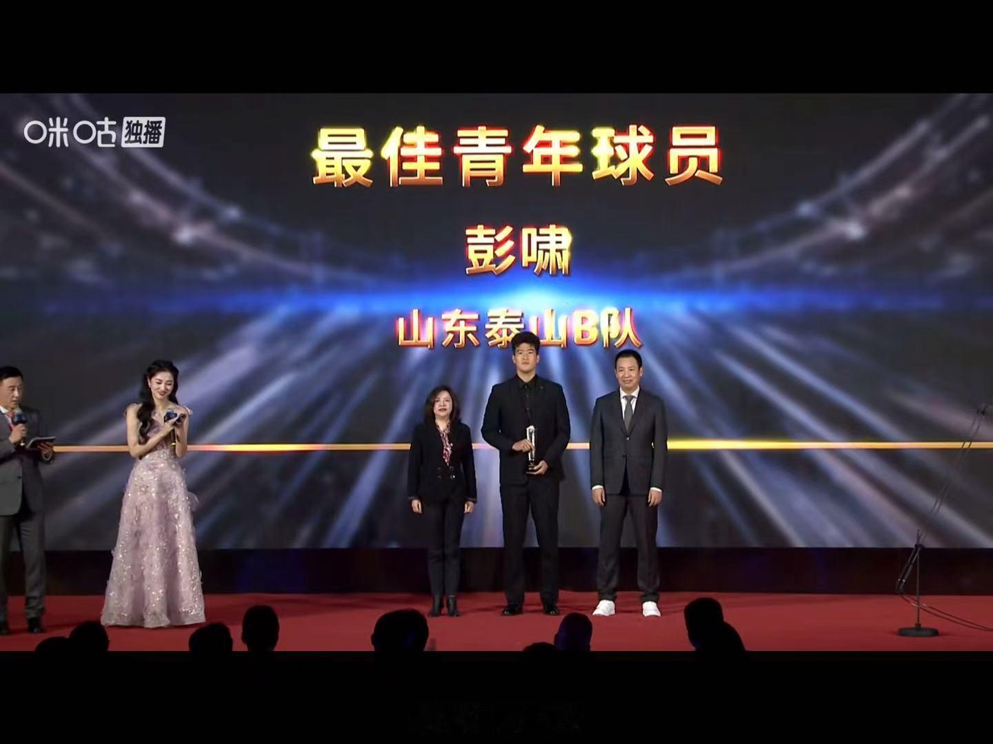 彭啸获中乙联赛最佳青年球员 中足联颁奖典礼自由橙山东泰山