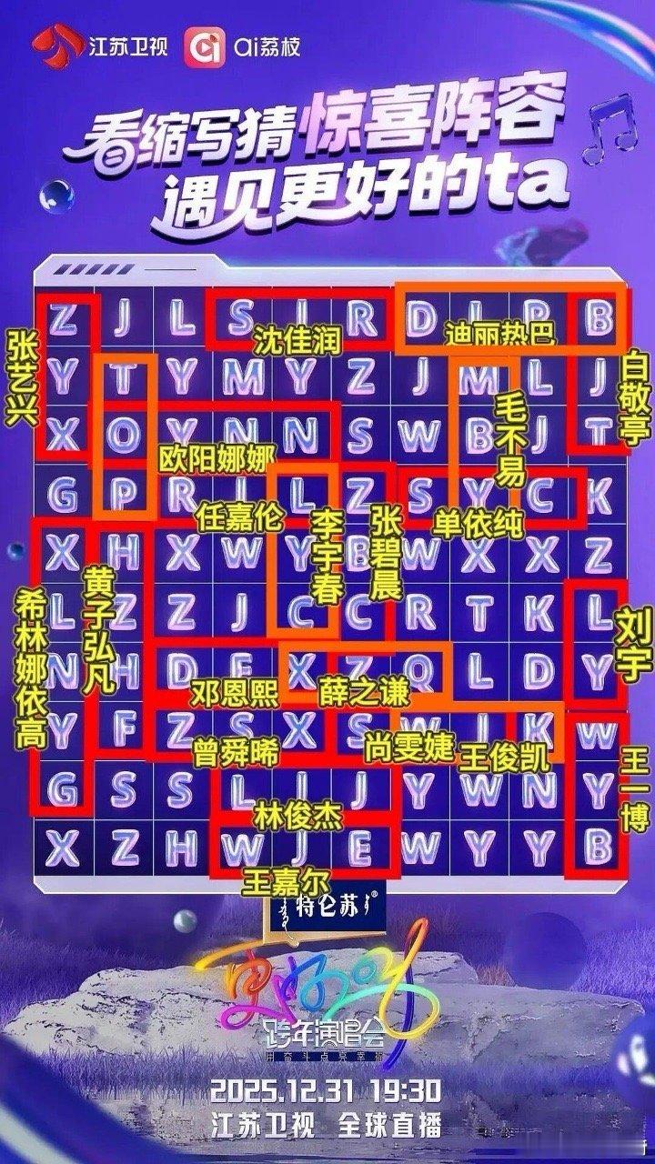 江苏卫视跨年你还我脑子江苏卫视跨年 被江苏卫视跨年整懵圈了!猜嘉宾环节比考研题还烧脑,缩写、笔画数轮番上阵,沉浸式刷题体验直接拉满,还好新老朋友阵容够亮眼,一边烧脑一边期待舞台,这波属实又虐又爱!