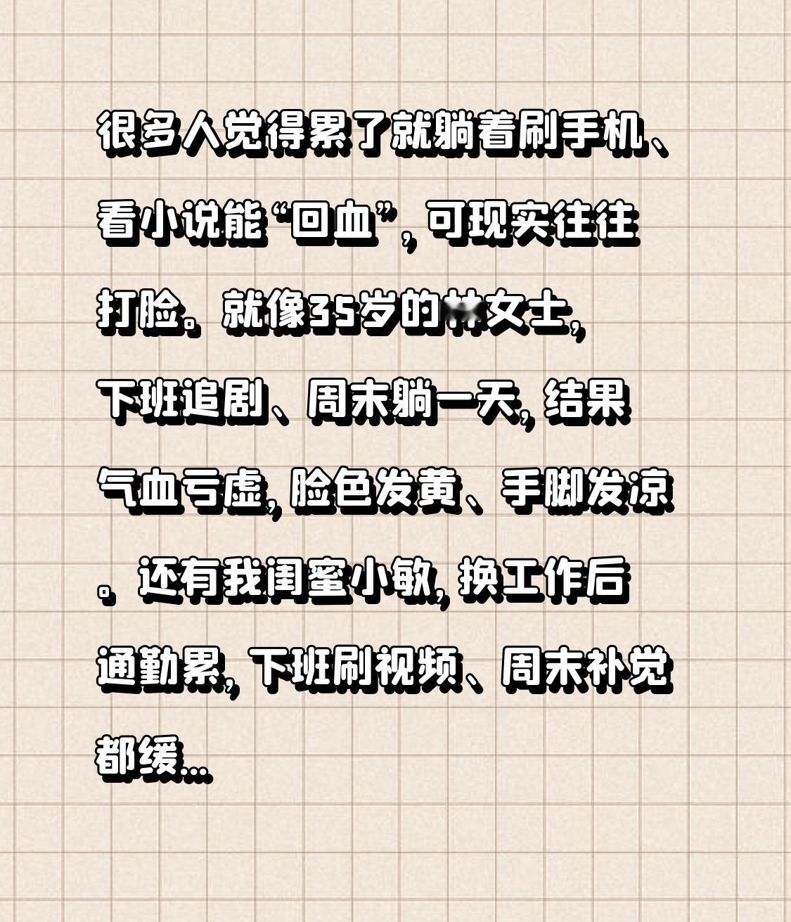 很多人觉得累了就躺着刷手机、看小说能“回血”,可现实往往打脸。就像35岁的林女士,下班追剧、周末躺一天,结果气血亏虚,脸色发黄、手脚发凉。还有我闺蜜小敏,换工作后通勤累,下班刷视频、周末补觉都缓不过来,最后内分泌紊乱。 其实,这种看似休息的方式,可能是在慢性耗伤身体。长时间瘫坐不动,气血运行受阻,反而越歇越累。别以为躺着刷手机就是休息,找对精力开关,停止内耗,才能真正“回血”。