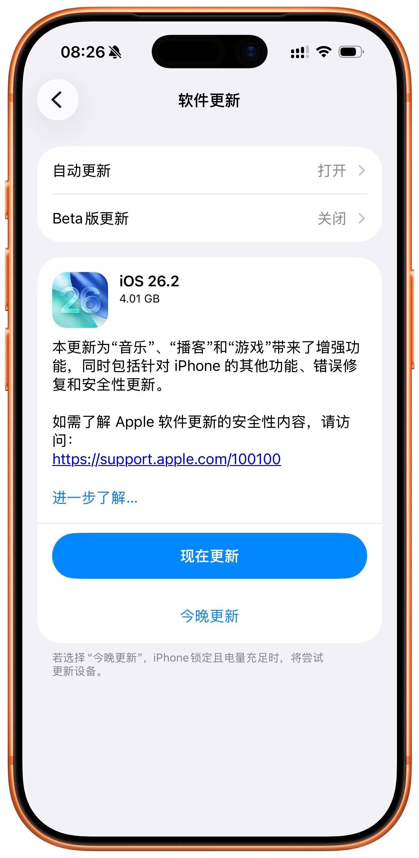 终于来了!iOS 26.2 正式版发布了!修复大量错误,建议已经在iOS 26 的小伙伴直接升级。已知更新内容:1. 锁屏时间显示支持玻璃透明度无极调节2. 测距仪功能新增液态玻璃动态交互效果3. 提醒应用新增闹钟触发联动功能4. 系统级菜单交互升级,动画效果更具Q弹质感5. 隔空投送功能新增双人临时文件共享模式6. 游戏应用模块新增启动画面,支持按应用大小排序7. 全新睡眠评分系统正式上线8. 相机、照片等核心应用完成系列功能增强大家都升了没,还有什么更新欢迎补充
