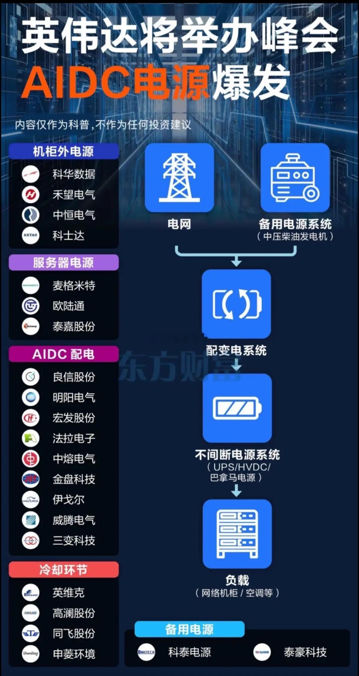 英伟达峰会引爆AIDC电源,中国企业如何织就算力供电网络?英伟达聚焦AIDC电源核心的数据中心电力短缺闭门峰会,定于2025年12月15日在美国加州圣克拉拉总部召开,12月12日英伟达已正式官宣会议信息。此次峰会为非公开闭门形式,核心聚焦AIDC电力短缺这一AI发展核心瓶颈,汇聚电力工程领域初创公司高管(含部分英伟达投资企业),旨在搭建从芯片到电力的全生态供电解决方案,标志着AI产业从算力竞争迈入能源攻坚阶段。此前市场曾披露会议将于12月下旬或当周举办,最终官方明确落定15日召开,会议成果或将进一步推动AIDC电源产业链技术升级与生态布局。当英伟达官宣举办AIDC电源峰会,AI数据中心的供电体系成为科技竞赛新焦点——从机柜外电源到冷却环节,中国企业已在AIDC电源全产业链形成密集布局,为AI算力的“电力心脏”筑牢国产化根基。机柜外电源是AIDC供电的第一道防线,科华数据的UPS产品适配超大型数据中心,能实现毫秒级切换保障供电稳定,市占率稳居国内前三;天望电气的高压配电设备为数据中心电网接入提供核心支撑,中恒电气的48V通信电源效率提升至98%,科士达则在海外AIDC项目中拿下20%的电源配套订单,成为出海标杆。服务器电源领域的竞争更聚焦高效化,麦格米特的钛金级服务器电源效率达96.5%,适配英伟达H100 GPU集群;欧陆通的1U电源实现小型化设计,为高密度服务器节省30%空间;泰嘉股份的电源连接件则凭借精密加工技术,成为服务器电源的核心配套。AIDC配电环节汇聚了国内电力设备的顶尖力量,良信股份的低压断路器为配电系统提供过载保护,市占率超35%;宏发股份的功率继电器实现AIDC配电的智能控制,法拉电子的薄膜电容让配电设备的寿命延长至15年;金盘科技的干式变压器适配数据中心高密供电场景,伊戈尔的高频变压器则为配电系统节能10%。中熔电气的储能熔断器更成为配电安全的“守门员”,能在微秒级切断故障电路,避免AIDC供电系统瘫痪。冷却环节与电源系统协同,共同保障AI算力稳定运行。英维克的液冷温控方案适配英伟达DGX超级计算机,能将GPU温度控制在40℃以下;高澜股份的浸没式液冷系统让数据中心PUE低至1.08,同飞股份的冷水机为服务器电源散热提供精准温控,申菱环境的精密空调则覆盖大型AIDC的整体冷却需求。备用电源领域的科泰电源、泰豪科技,其柴油发电机组能在电网中断时实现秒级启动,为AIDC供电提供最后一道保障。2025年全球AIDC电源市场规模突破800亿元,英伟达峰会的召开进一步催化行业需求,而中国企业从核心设备到配套部件的全链条布局,让AIDC电源国产化率从50%跃升至80%。当科华数据的UPS、英维克的液冷、金盘科技的变压器融入英伟达的算力供电体系,中国不仅掌握了AIDC电源的核心制造能力,更成为全球AI算力基础设施建设的关键参与者。