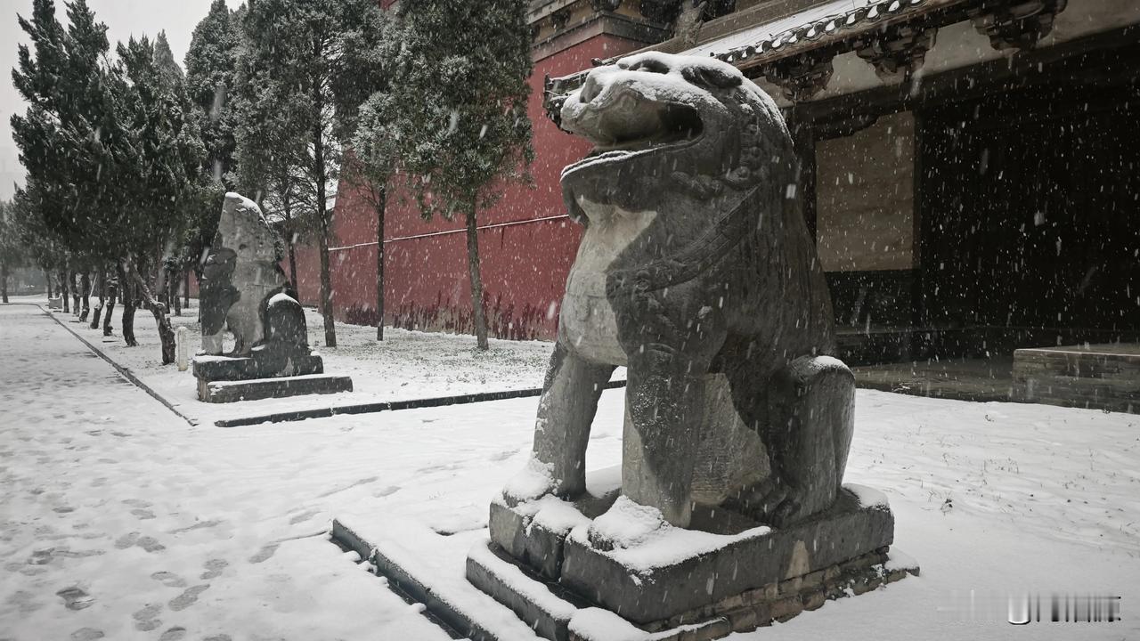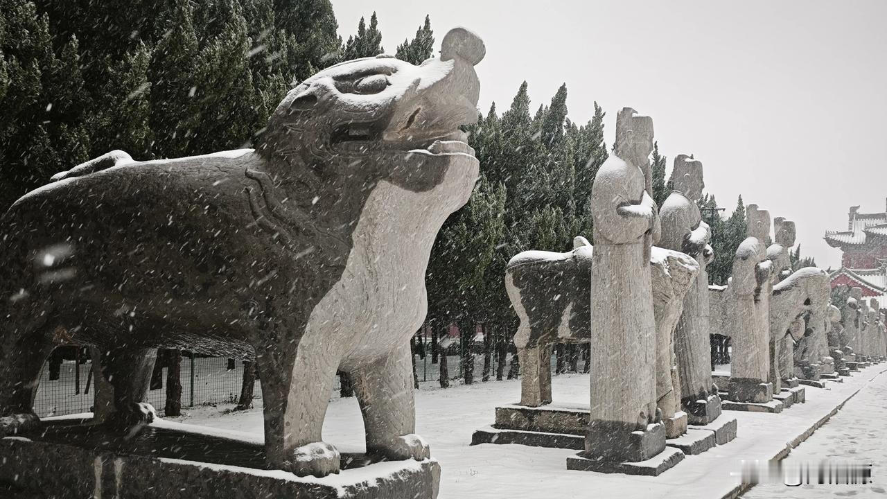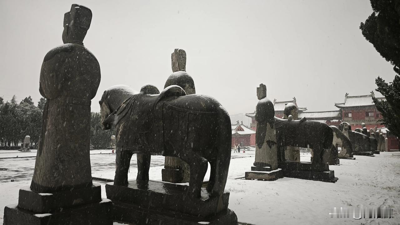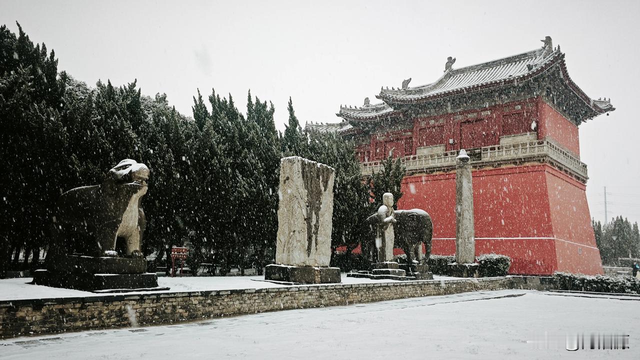 永昭陵大雪纷飞,屹立千年的石像生,红墙黛瓦的古建筑,在白雪的映衬下更显庄严肃穆巩义宋陵石像生 宋陵 神采巩义 大雪