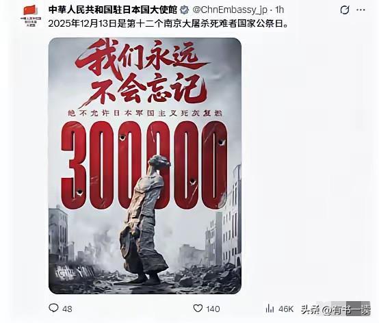 没有一个日本字,却字字戳心!12月13日第十二个南京大屠杀死难者国家公祭日,中国驻日大使馆的一条发文,直接让无数国人破防。 配图里,巨大的红色“300000”赫然醒目,下方是衣衫褴褛、身形佝偻的受难者形象。这串数字,不是冰冷的符号,是1937年南京城里30万同胞的哀嚎与血泪;这幅图,不是简单的插画,是侵略者无法抵赖的罪证。 没有一句谴责,没有一个日本字,驻日使馆的这条公祭日发文,却比千言万语更有力量。红色的“300000”像一记重锤,砸在每个国人的心上,也砸向那些试图篡改历史的人。这种“无声胜有声”的表达,是最硬核的态度——历史真相无需赘述,血色记忆不容篡改,这是对遇难同胞的告慰,更是一个民族的铮铮风骨! 不写日本,不是遗忘,而是不屑用多余的文字去赘述暴行;不提控诉,不是软弱,而是这串血色数字,足以让全世界看清历史真相。 今天,我们铭记不是为了延续仇恨,而是为了警示:和平从不是凭空而来,忘记历史,就是对未来的背叛!南京大屠杀