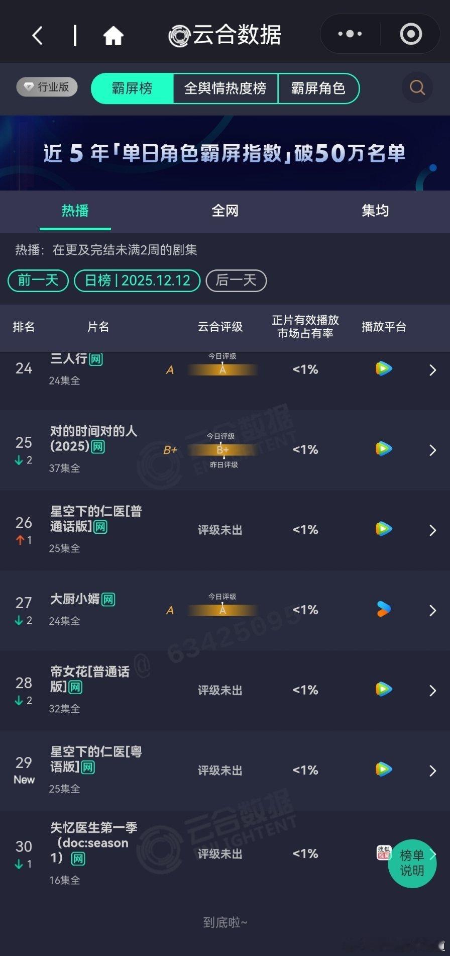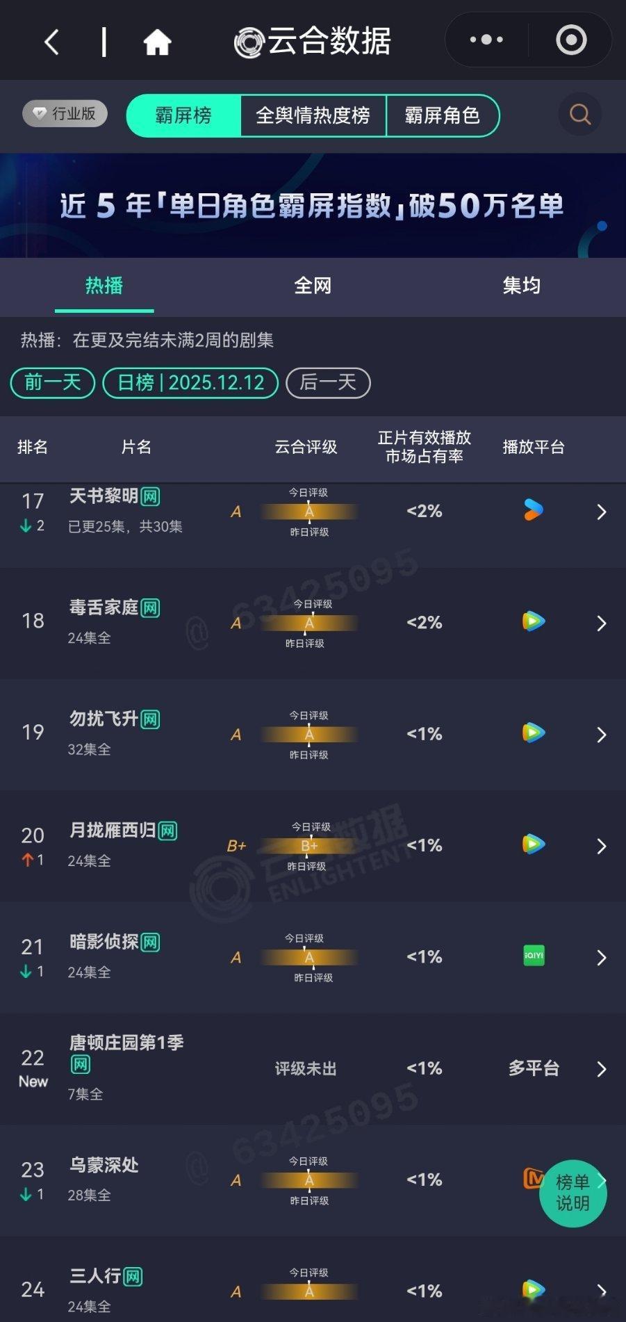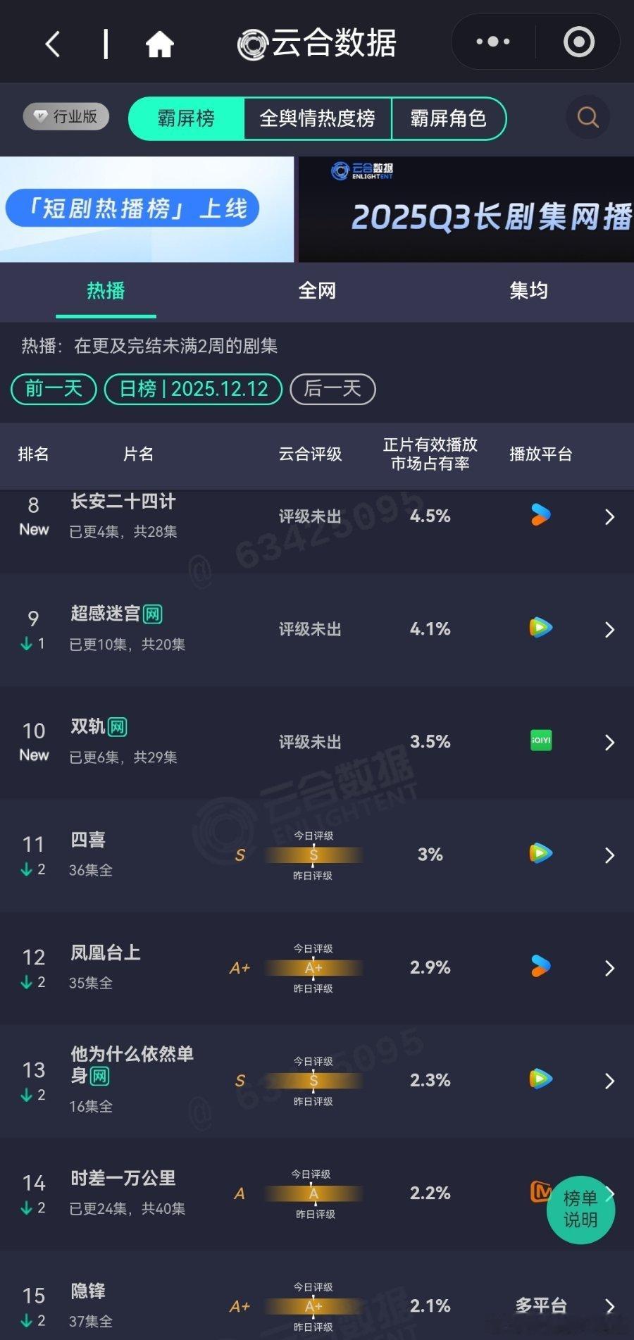 12月12日云合播放占比云合 大生意人21.5%大生意人 狙击蝴蝶12.1%风与潮6.9%风与潮 单更了,稳住慢慢爬也行长安二十四计云合4.5%热开有了双轨云合3.5%双轨 符合预期吧,不算特别好,一般水平,毕竟是6集。