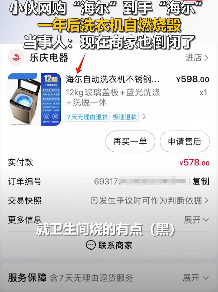 太坑人了!江苏苏州。男子回家时闻到一股烧焦味道,仔细一看才发现卫生间的洗衣机竟自燃烧毁,而这个洗衣机刚买了不到一年,下单时以为买的是“海尔”洗衣机,收货后才看清是山寨品牌“海尓”,现在去找商家,却发现商家早已倒闭 倪先生介绍,当时家里其他东西都好好的,只有洗衣机彻底烧毁了,火源很明显就是它。这台机器是去年六月份在网上买的,下单的时候,页面看起来挺正规,他以为自己买的是知名品牌海尔的洗衣机,结果收到货仔细一看,才发现商标上写的是“海尓”,两个字长得很像,不仔细辨别根本分不清 发现是山寨货后,倪先生心里有些不痛快,但想着自己一个人住,将就用用算了,毕竟也花了将近六百块钱,退换货也麻烦,想着就洗个衣服而已,问题应该不大 结果就是现在这样,人没事算是万幸,卫生间直接报废一半,后续维修、清理,都是实打实的钱和精力。更糟心的是,出事之后再去找商家,发现对方早就关门跑路,连个说理的对象都没有 这类事让人心里发堵的地方,不只是洗衣机烧了,而是那种一步步被套路进去的感觉。页面设计得像大牌,名字故意擦边,价格压得很低,让人产生一种捡到便宜的错觉。等你反应过来,已经拆箱用了,再退嫌麻烦,心里一松,风险就被自己扛下来了 很多人其实都会做出和倪先生一样的选择。不是不知道有问题,而是低估了后果。省下来的那点钱,在安全面前真的不值一提。洗衣机这种每天通电、还接水的家电,一旦出事,轻一点是烧机器,重一点就是整屋遭殃 这件事给人的提醒其实很直接。第一,网购家电一定要看清品牌和资质,不要只盯着价格。第二,一旦发现货不对板,哪怕麻烦,也要第一时间退。第三,家里老旧或来源不明的电器,能不用就别用,尤其是人不在家的时候,最好直接断电